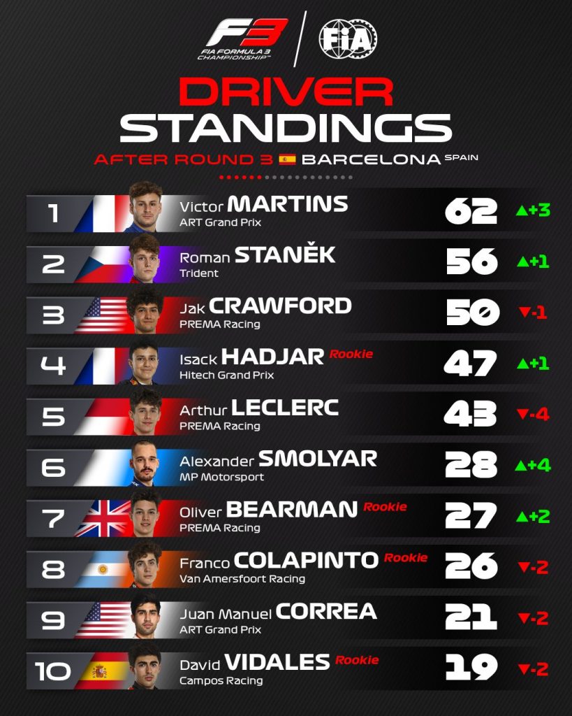 In Formula 3 invece i contendenti per il titolo sono stati più inclini a scambiarsi le posizioni: nella Feature Race del sabato Martins si è ritirato per un problema di affidabilità, favorendo Crawford (secondo), Leclerc (quarto) e Stanek (ottavo). Nella Sprint Race della domenica, invece il francese della ART, gioiello della Alpine, ha dominato alla grande dopo una gran partenza, in cui ha bruciato il poleman Stanek. Il pilota ceco ha comunque chiuso secondo, approfittando della pessima gara di Leclerc (evidentemente la fortuna non era di famiglia sul circuito catalano), che prima ha avuto una pessima partenza, poi si è toccato con Vidales, e infine ha preso una penalità di cinque secondi, scivolando fuori dai punti. Ora la classifica recita: Martins 62, Stanek 56, Crawford 50, Hadjar 47 e Leclerc 43.