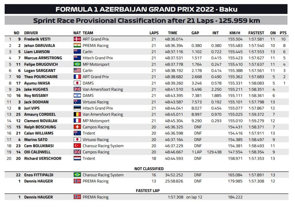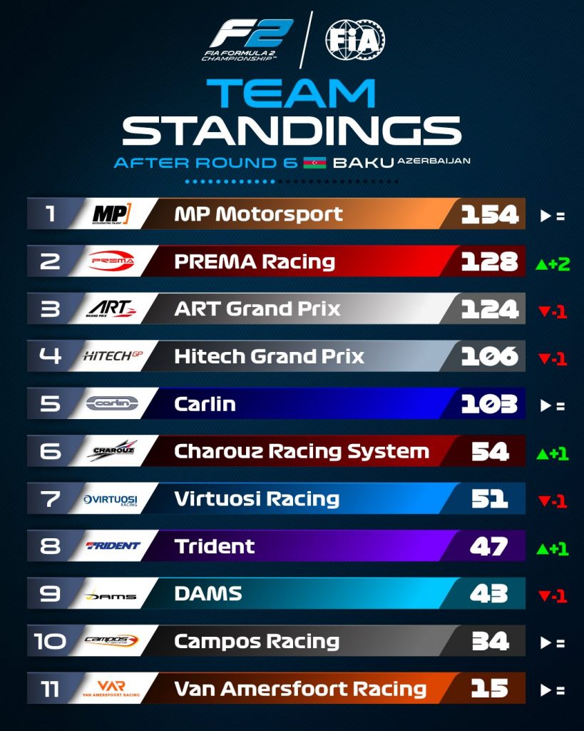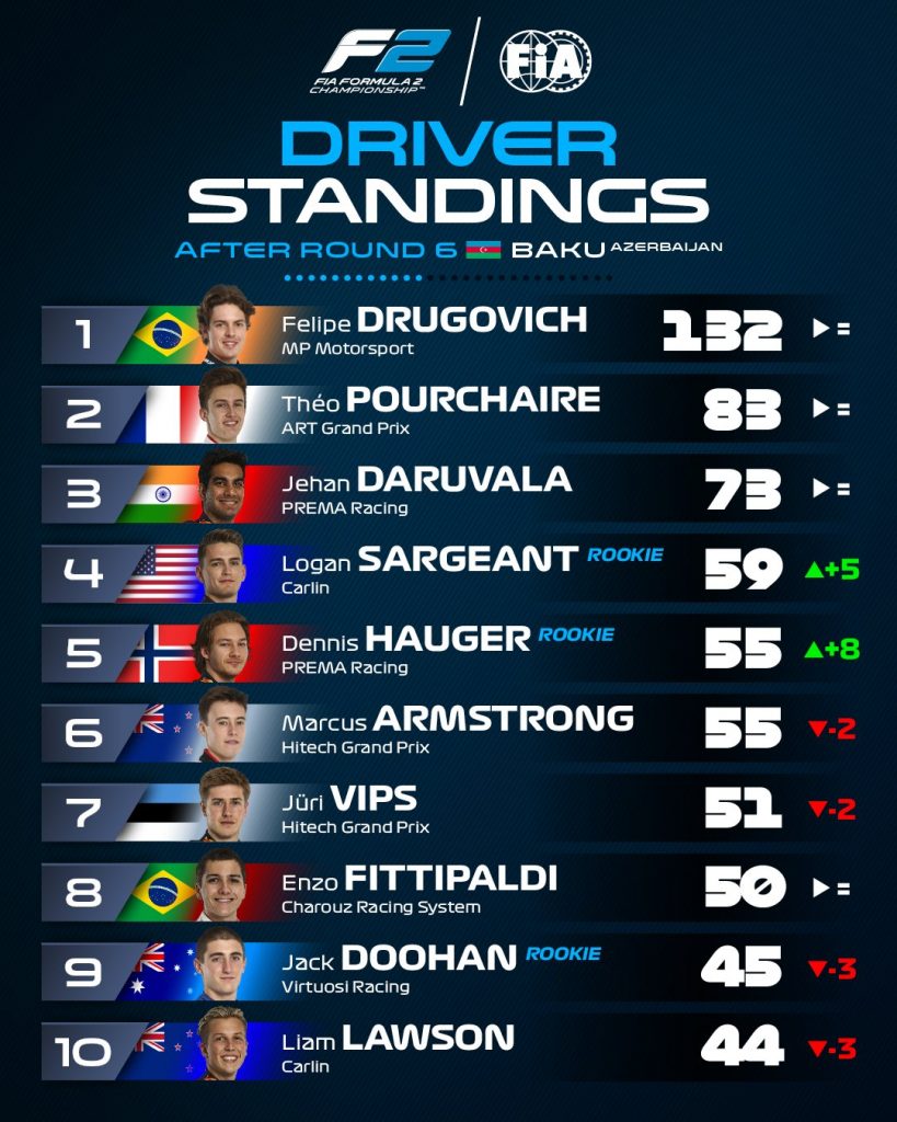 Per quanto riguarda la lotta per il campionato, in questo weekend Drugovich ha dimostrato una grandissima maturità: qualificatosi quinto, probabilmente sapeva di non avere il passo per vincere, ma con Pourchaire dodicesimo in griglia ha potuto pensare a gestire, e quindi in entrambe le gare ha cercato di tenersi lontano dai rischi, molto comuni sulla pista azera. Nella Sprint Race ha chiuso sesto, guadagnando altri due punticini sul francese, ottavo, mentre nella gara domenicale il brasiliano ha sapientemente sfruttato i problemi incorsi alle due Hitech per risalire in terza posizione. Disastro invece per Pourchaire, che in una ripartenza ha avuto un contatto danneggiando l’ala per i troppi zigzag nelle retrovie e per il compattamento del gruppo tipico dei restart di Baku. Alla fine ha chiuso fuori dai punti, perdendo altre quindici lunghezze sul rivale, che oramai può seriamente iniziare a pensare in grande.