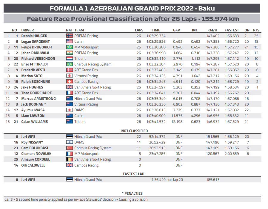 Certamente la notizia principale del weekend riguarda il clamoroso errore di Juri Vips nelle fasi finali della Feature Race. Il pilota estone della Hitech, partito dalla pole, stava gestendo abilmente la prima posizione, nonostante le diverse neutralizzazioni, quando a cinque minuti dal termine (la gara è terminata in tempo invece che in giri) è incredibilmente andato a sbattere mentre aveva un discreto vantaggio sul suo inseguitore Hauger alla curva 8, quella del castello, danneggiando pesantemente il muso e la sospensione anteriore destro e costringendosi quindi al ritiro. Ad approfittarne è stato quindi appunto Hauger, che dopo la vittoria a Monaco nella Sprint Race stavolta si è imposto in una Feature, dimostrando di essere in crescita e di star avvicinandosi alla vertice della categoria. Il weekend del norvegese non è però stato esente da errori: durante la Sprint Race, infatti, mentre era in lotta con Pourchaire per conquistare dei punti, ha completamente sbagliato la staccata di curva 3, andando a muro da solo. In ogni caso, con il successo ha guadagnato in un colpo solo otto posizioni in classifica, salendo addirittura fino al quinto posto.