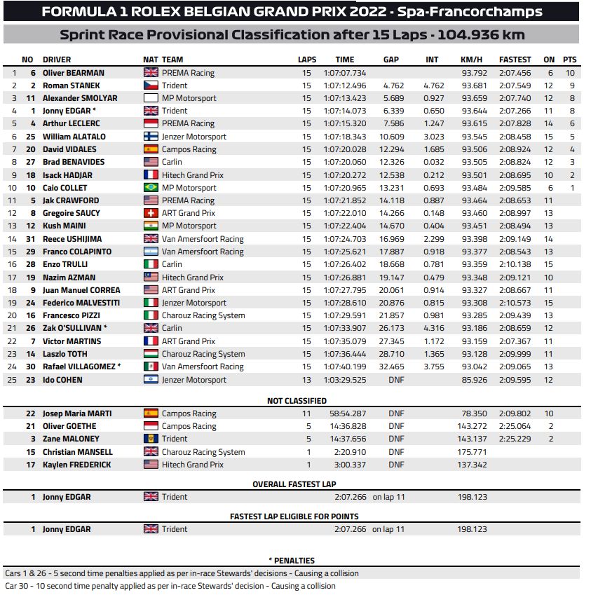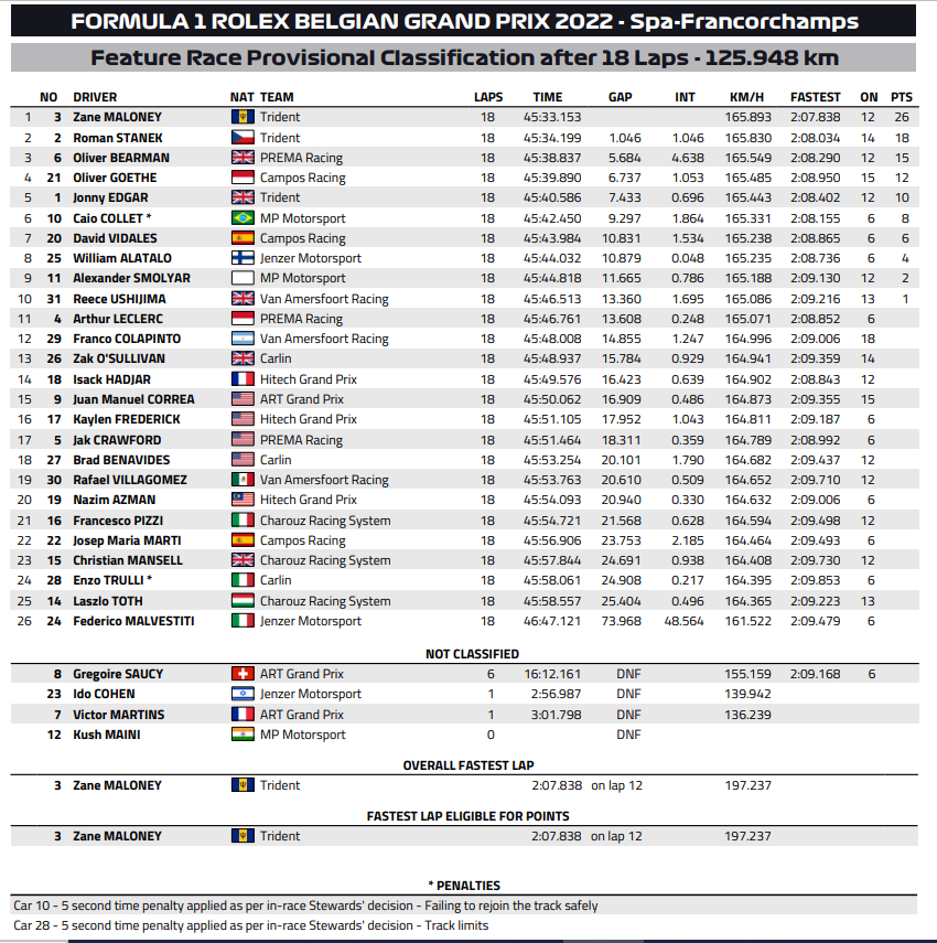 Ovviamente, non è stato solo Bearman il protagonista del weekend. Due piloti che hanno lasciato il segno, sia in positivo che in negativo, sono Maloney e Goethe; i due, infatti, al sabato sono venuti a contatto in un terrificante incidente al Blanchimont. Fortunatamente non ci sono state conseguenze, nonostante la dinamica dell’impatto, ma il botto è stato tale da causare una bandiera rossa di mezz’ora. Alla domenica, invece, il pilota delle Barbados è stato impeccabile e, partito secondo, ha vinto alla grande, divenendo il primo della sua nazione a trionfare in una gara di Formula 3 internazionale. Domenica positiva anche per il danese con licenza monegasca, che, dopo il buon esordio a Budapest, ha conquistato un buon quarto posto, che con una Campos non al top è davvero un buon risultato. Goethe sta decisamente stupendo in positivo, e non credo passerà molto prima che qualche team (di prima fascia nella categoria, ma anche di F1) si accorga di lui.