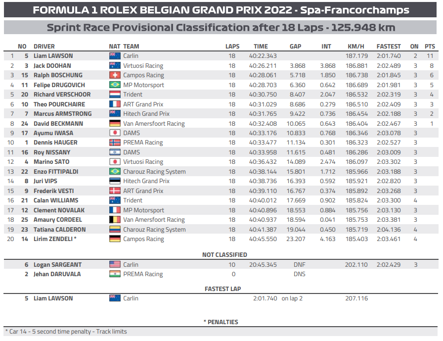Weekend da incornicare anche per Lawson, con il neozelandese che ha vinto in gara 1 e ha chiuso al terzo posto in gara 2. Un doppio podio sicuramente di grande prestigio, in un finesettimana condito anche dalle FP1 disputate con l’Alpha Tauri in F1, le prime della sua vita. Sì potrebbe avere di meglio dalla vita? (E qui ci starebbe un noto marchio di amaro, come diceva una pubblicità di qualche anno fa).