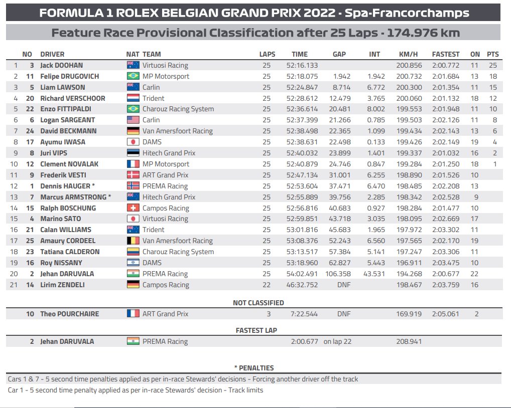 Bisogna parlare anche dei ragazzi più grandi. Nella nostra preview avevamo detto che Doohan, forte delle vittorie dello scorso anno in F3, avrebbe potuto ripetersi: e così effettivamente è stato. L’australiano nella Feature Race ha prima scalzato due vetture al via, e poi ha passato Drugovich al pit stop grazie all’undercut, ottenendo così un’ottima vittoria, che si aggiunge al secondo posto ottenuto nella Sprint Race del sabato. Il brasiliano può però essere contento lo stesso: se nella Sprint Race aveva guadagnato qualche punto su Pourchaire, grazie ad una scellerata quanto geniale strategia di cambiare le gomme sotto Safety Car (recuperando otto posizioni in quattro giri), nella gara domenicale è stato addirittura graziato dalla rottura del propulsore della ART del rivale. Questi due colpi, sommati alla pole del venerdì, hanno consentito al brasiliano di tornare ad avere un vantaggio di 43 punti (205 a 162) sul rivale, dopo che questo era pericolosamente sceso dopo Budapest. Non un distacco abissale, ma con tre round (oltre a Zandvoort e Monza la F2 correrà anche ad Abu Dhabi) e quindi sei gare il pilota della MP Motorsport può iniziare a gestire, lasciando a Pourchaire l’onere di doversi svenare per rimontare.