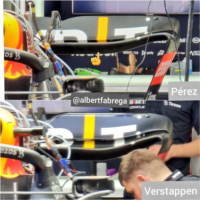Red Bull che testerà – almeno nelle FP1 – due configurazioni di ali diverse sulle vetture di Perez e Verstappen. L’ala di Max presenta un gurney flap (o nolder) nella parte superiore, utile ad aumentare il carico a basse velocità senza creare problemi particolari di drag.