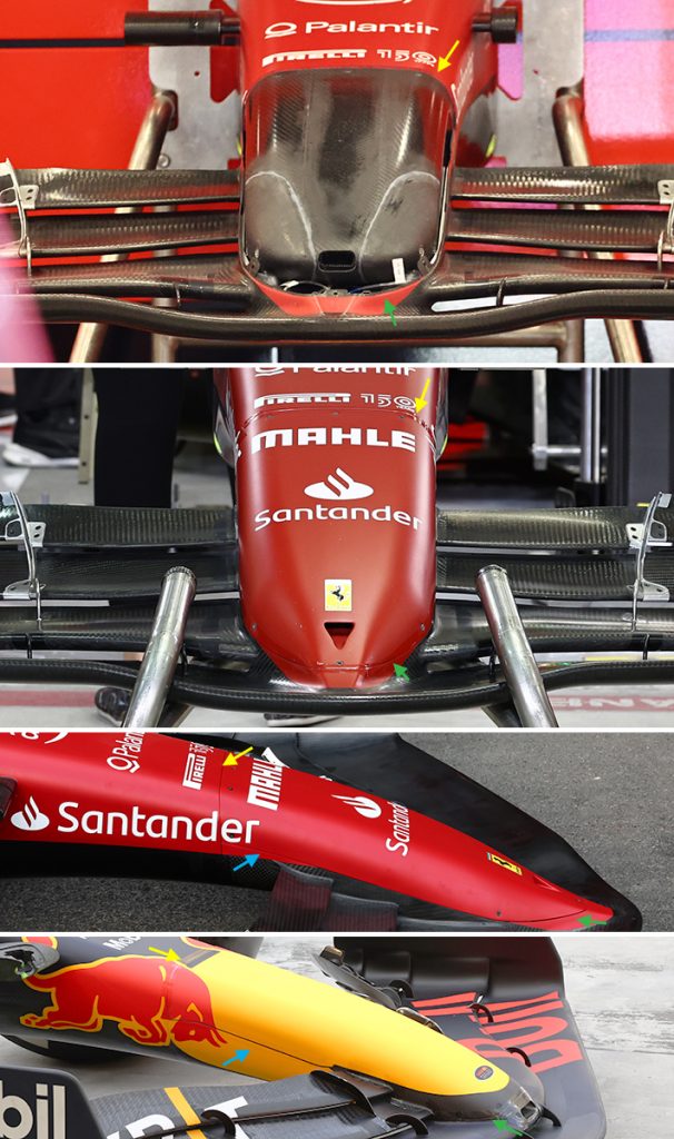 Ferrari senza particolari aggiornamenti questo weekend, ma ne approfittiamo per offrirvi un bel paragone tra il muso della rossa e quello Red Bull di cui parlavamo qualche riga sopra.