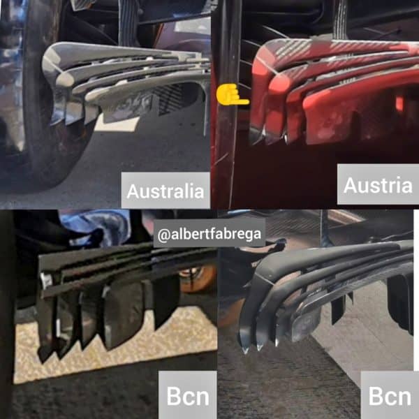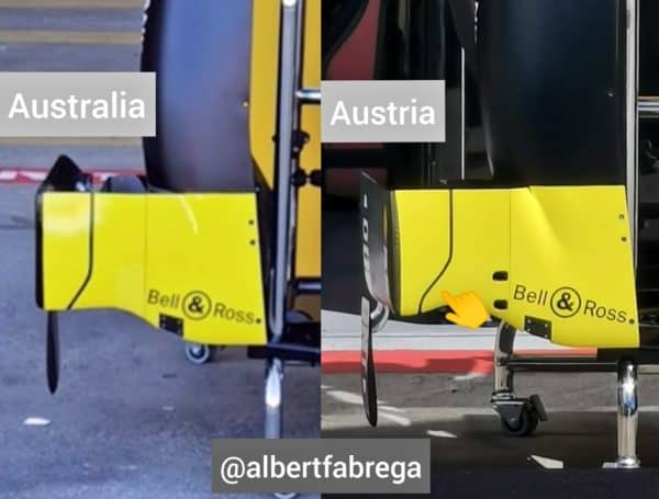 Renault ha semplificato i propri bargeboards, togliendo alcune delle molte branchie presenti nei test. Aggiunte invece delle “pinne”, utili a migliorare la direzione imposta al flusso.