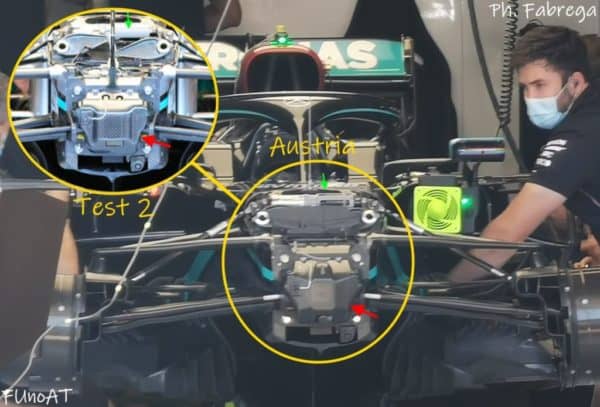Cambia anche la configurazione degli specchietti, che tornano ad una forma simile a quella dell’anno passato negli ancoraggi alla carrozzeria. Probabilmente la scelta è pensata per favorire il passaggio dell’aria nei tradizionali sfoghi appena dietro il cockpit, con Mercedes che solitamente allarga queste aperture in Austria per favorire il raffreddamento della Power Unit. Va anche detto che il passaggio alla livrea nera ha accontentato Hamilton ma non gli ingegneri: tale colore non è stato ben visto dal reparto performance della casa di Stoccarda, che visti i noti problemi di raffreddamento della PU non contribuirebbe allo smaltimento termico in modo adeguato.