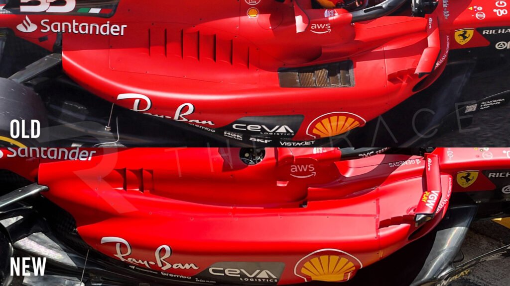 Debutta questo weekend l’aggiornamento che fa abbandonare definitivamente il design dei catini nella parte superiore delle pance tipici di Ferrari sin dalla F1-75. Le nuove fiancate si spostano più verso una filosofia in stile Red Bull, con un forte downwash richiamato dalla parte esterna e una parte incava nella parte più interna molto più minimale che richiama il flusso verso la beam wing.