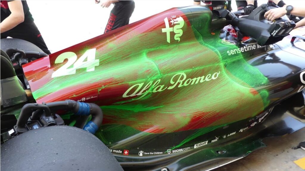 La novità più influente, però, è quella che non si vede: fondo completamente nuovo (almeno per ciò che si può cogliere dal bordo esterno) con una geometria simile allo stile McLaren e Mercedes nella parte dei primi generatori di vortice (outlet strakes esterni) e zona antecedente la ruota anteriore molto anti-porpoising, con alcune forme che ricordano quello usato dalla F1-75 nella prima parte di stagione. Sembra scomparso il “mousehole” nella parte iniziale del diffusore.