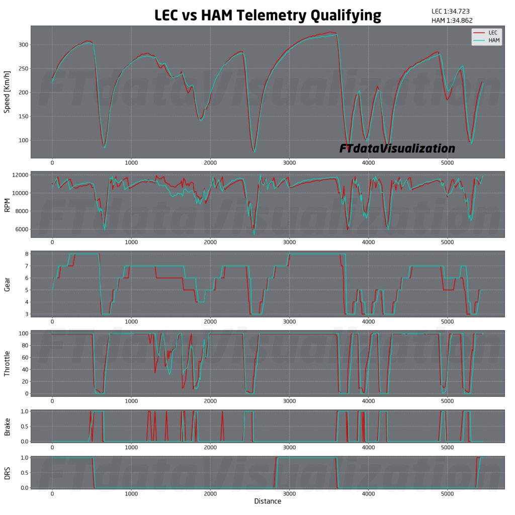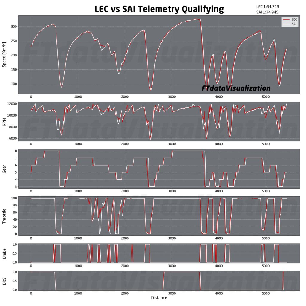 Guardando le telemetrie si nota una Ferrari decisamente più veloce di Mercedes in rettilineo mentre McLaren e Red Bull pagano un gap di velocità minore sul dritto rispetto alla monoposto italiana. La Ferrari è invece la più lenta delle quattro squadre nelle curve veloci, come curva 5 e curva 19. In particolare in quest’ultima le due Ferrari hanno fatto registrare velocità minime di percorrenza fino a 10 km/h più basse rispetto ai rivali diretti, forse a causa dell’assetto più scarico e forse a causa delle gomme andate fuori dalla giusta finestra di utilizzo dopo la lunghissima sequenza di curve a destra che va dalla 16 alla 18. Un difetto che potrebbe rendere le monoposto di Leclerc e Sainz più vulnerabili agli attacchi dei rivali sul rettilineo principale.