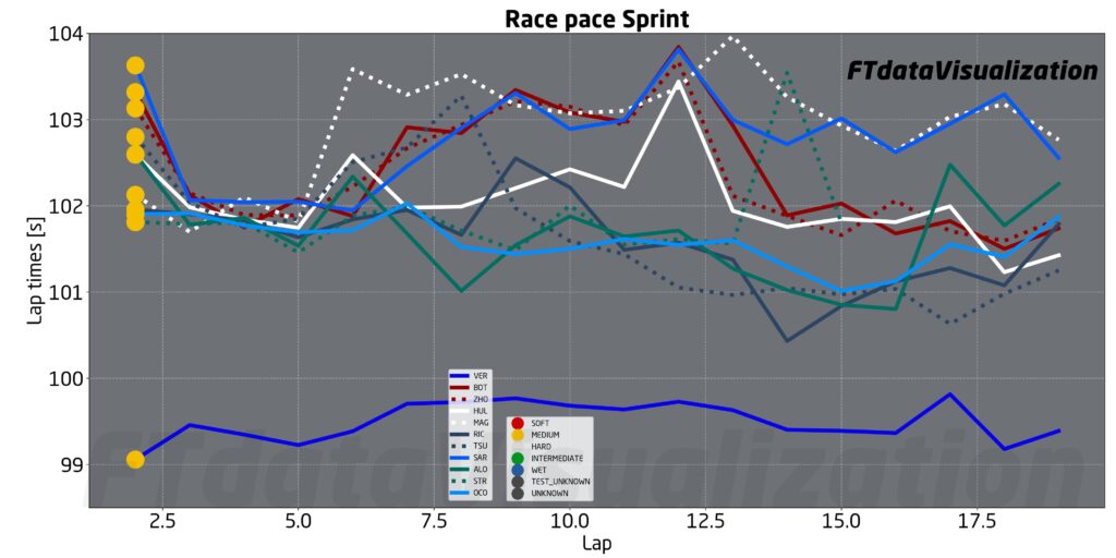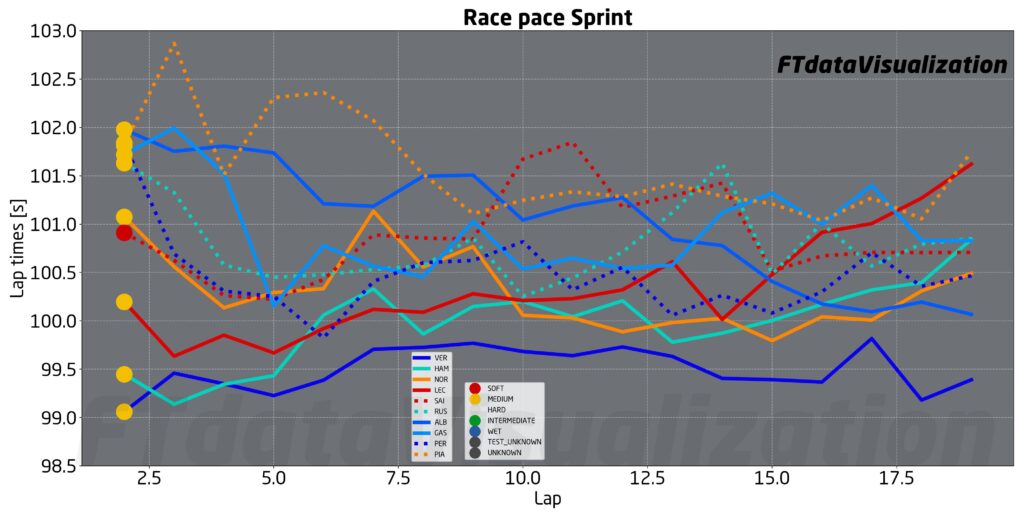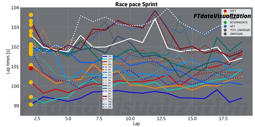 La gara Sprint di sabato ci ha permesso di farci un’idea sui valori in campo per quanto riguarda il passo gara dal momento che tutti, tranne Sainz, hanno usato la stessa gomma e la stessa strategia. Verstappen ha mostrato un‘ottima gestione gomme. Una gestione talmente buona che, nonostante la partenza dalla sesta posizione, può essere considerato il favorito per la vittoria della gara. L’olandese infatti è riuscito a mantenere tempi intorno all’1:39.5 per tutti i 19 giri di gara mentre i suoi rivali diretti hanno mostrato un degrado maggiore. Tra i quattro team di testa la Ferrari di Leclerc è quella che ha mostrato la gestione gomma peggiore, arrivando a girare addirittura 2 secondi al giro più piano di Verstappen nel finale. Sotto questo punto di vista Mercedes e McLaren sono sembrate decisamente superiori alla scuderia italiana e probabilmente saranno le squadre che si giocheranno i posti sul podio insieme a Verstappen salvo eroiche difese di Leclerc.
