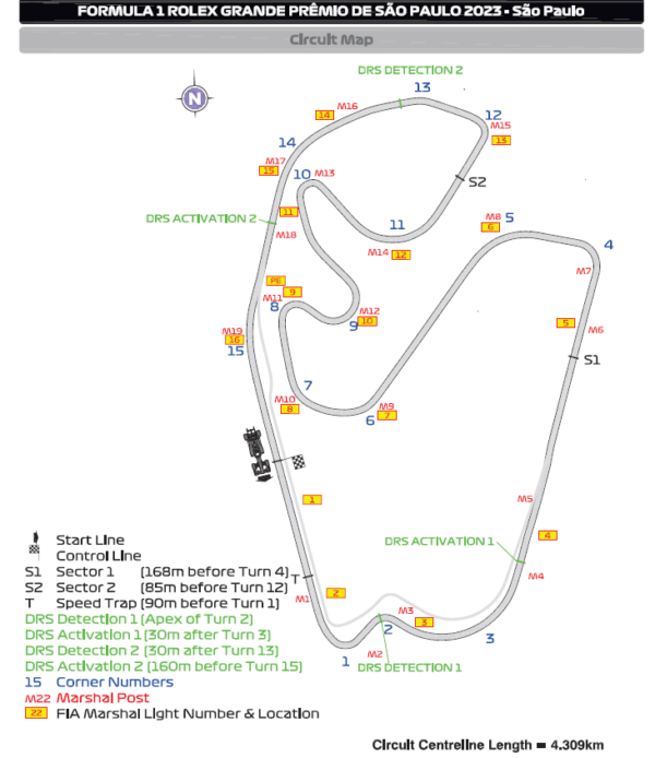 Le condizioni della pista sono peggiorate sensibilmente nella Q3: la temperatura della pista si è abbassata sensibilmente mentre il vento si è alzato. Molti piloti hanno commesso degli errori per via della pista molto più lenta. Verstappen è stato ben 6 decimi più lento rispetto al suo miglior giro in Q2 ed è stato quello che ha perso di meno! Vediamo cosa hanno combinato gli altri, ma prima di tutto ecco qui sotto una mappa del circuito per avere i riferimenti delle curve.