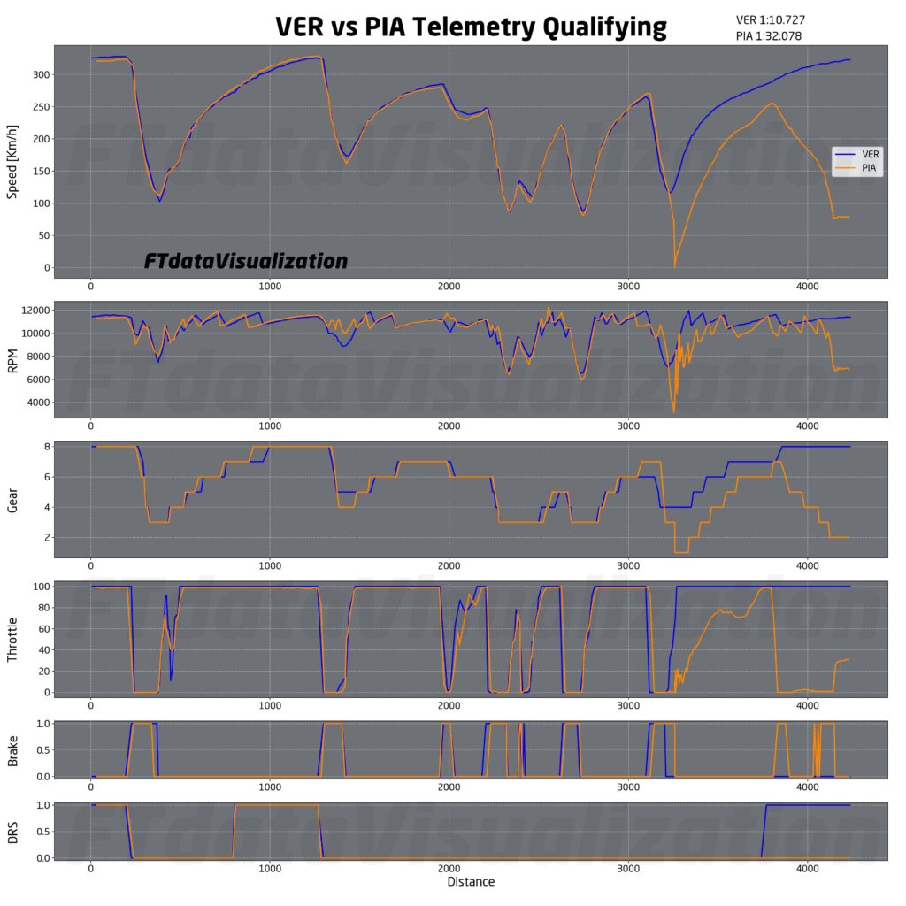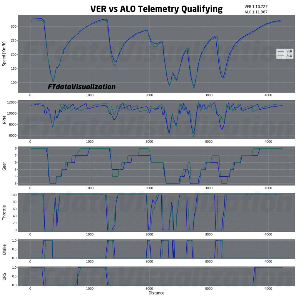 Sainz è stato forse il pilota che è stato messo più in difficoltà dal variare delle condizioni meteo. Lo spagnolo ha pagato oltre 20 km/h nelle due curve veloci del secondo settore perdendo moltissimo tempo. Dal grafico dell’acceleratore notiamo come lo spagnolo sia stato costretto addirittura a frenare in curva 6, verosimilmente dopo un controllo.