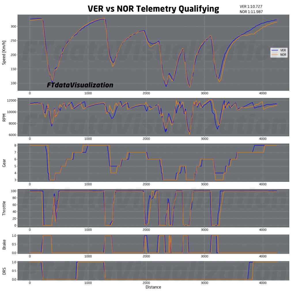 Per avere un’idea di quanto sia cambiata la pista nei pochi minuti che separano la Q2 dalla Q3 confrontiamo i due migliori giri di Verstappen nelle due sessioni. In blu il Verstappen del Q3 e in bianco quello del Q2. Si nota come, nonostante inizialmente l’olandese stesse andando più veloce rispetto al suo miglior tempo della sessione precedente, a partire da curva 8 abbia iniziato a perdere parecchio. La differenza di velocità è diventata molto evidente nell’ultimo settore dove il #1 ha perso addirittura più di 3 decimi in un settore da 16 secondi formato praticamente da una sola curva e un rettilineo. Ciò non deve sorprendere dal momento che il maltempo stava arrivando da ovest.