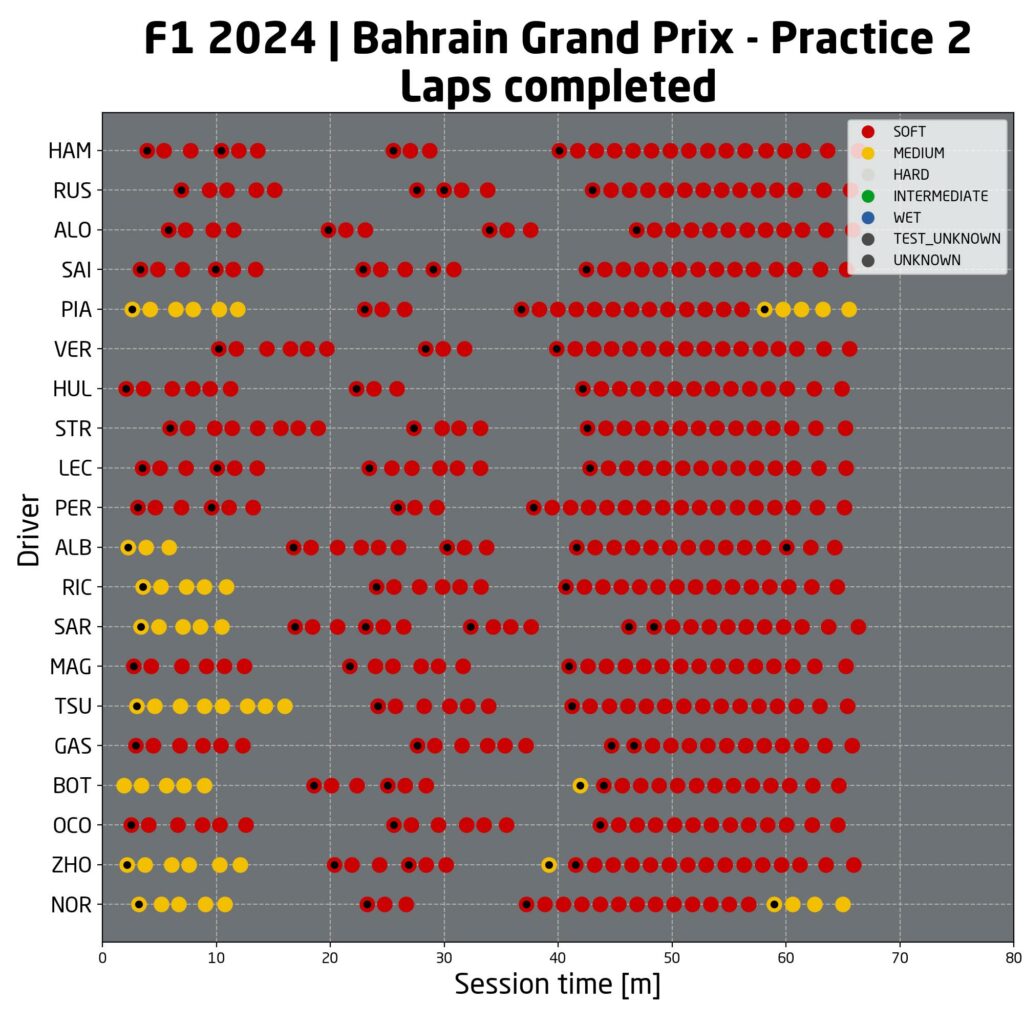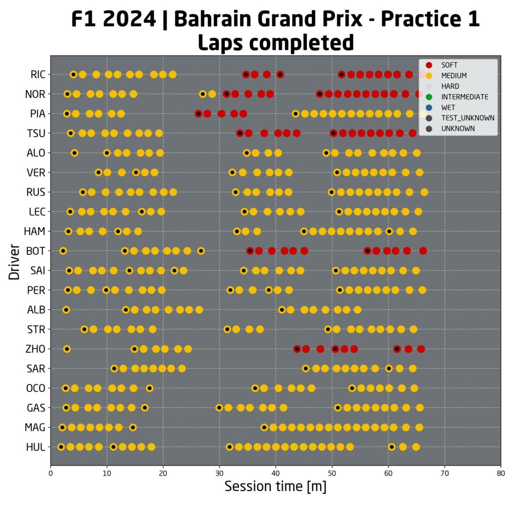 Durante la prima sessione di prove libere in Bahrain quasi tutti i team si sono concentrati nel trovare l’assetto giusto utilizzando gomme medie. Racing Bull, McLaren e Sauber hanno anche provato un paio di giri veloci con gomme soft. Nel finale di sessione la maggior parte dei team ha effettuato una breve simulazione di passo gara di 6-7 giri. Un lavoro leggermente diverso è stato fatto dalla Haas che, come nel corso dei test invernali, si è concentrata totalmente sui long run con carico di benzina. Il team italo-americano infatti sta provando a risolvere i grandissimi problemi che aveva lo scorso anno nel gestire le gomme e, sebbene queste siano solo le prime sessioni, sembra essere riuscito a migliorare rispetto al 2023.