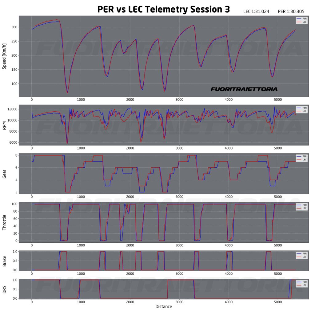 Guardando invece il giro di Alonso confrontato con quello di Perez si nota come Aston Martin utilizzi marce molto più corte di Red Bull e più corte anche di Ferrari. Alonso infatti percorre la sequenza di curve tra le 5 e la 7 con una marcia più alta rispetto a Perez e, come lui, scala di una per affrontare la curva. Entrambi alzano il piede dall’acceleratore, ma lo spagnolo riesce a tornare al 100% del gas più tardi a causa del minor grip della sua vettura. Il fatto di avere marce molto corte è una caratteristica comune a tutti i motorizzati Mercedes fatta eccezione per McLaren, che utilizza marce più lunghe.