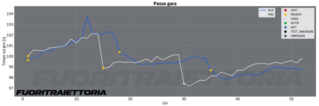 Rimanendo nelle zone basse della classifica possiamo anche vedere un confronto tra Magnussen e Albon, che hanno effettuato le loro simulazioni nel pomeriggio italiano, quindi nella serata mediorientale con pista più fresca. Nonostante i tempi molto simili tra i due possiamo notare due approcci molto diversi: Magnussen spinge subito e poi la gomma degrada in modo costante mentre Albon si contiene maggiormente nei primi giri in modo tale da rimanere con tempi più costante nel corso del run.