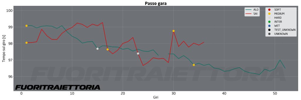 Passando invece alle posizioni di testa vediamo l’incredibile simulazione di gara di Alonso paragonata con quella di Sainz. Entrambi hanno effettuato i loro giri in serata, dopo anche Magnussen e Albon. Le condizioni della pista erano le migliori possibili: massima gommatura e temperature più basse, ma nonostante questo fa impressione la progressione di Alonso, l’unico pilota in grado di migliorarsi costantemente giro dopo giro mostrando un degrado gomme estremamente basso. La Ferrari invece ha effettuato un lavoro un po’ diverso facendo qualche sosta in più senza portare a termine una simulazione completa. Il team di Maranello, dopo i brutti run con alto carico di benzina messi in mostra nella seconda giornata in cui i tempi salivano di due secondi, sembra aver trovato la quadra nel terzo giorno.