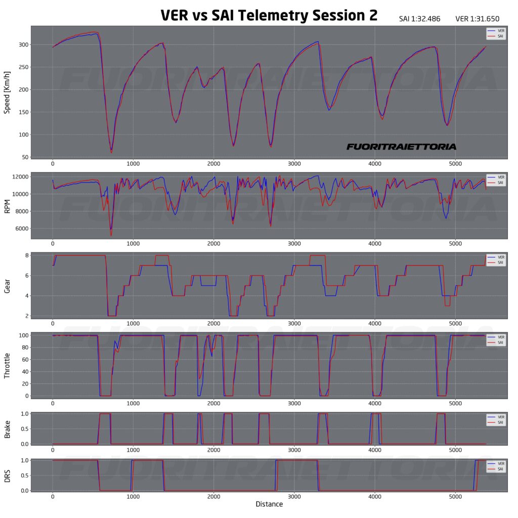 Un’altra differenza importante tra le due vetture si ha tra le curve 6 e 7, passaggio dove Red Bull guadagna parecchio. Guardando la telemetria si nota come la Ferrari rimanga in sesta marcia per tutta la sequenza e i suoi piloti riescano a non alzare del tutto il piede dal gas. Al contrario i piloti Red Bull alzano del tutto il piede dal gas e scalano una marcia riuscendo però a tornare prima al 100% della farfalla. Questa differenza di approccio è presente con entrambi i piloti e con diverse mescole di gomma.