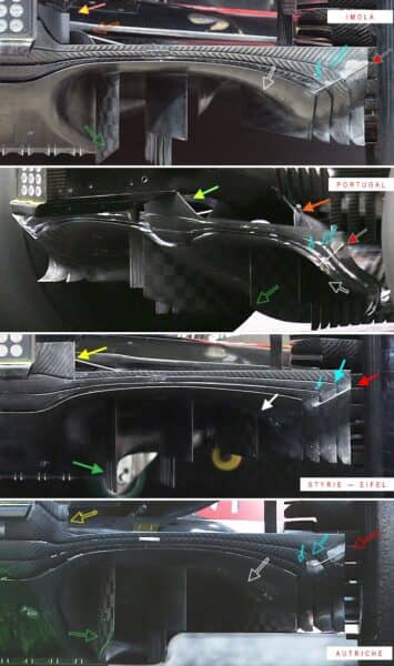 La comparazione avviene in ordine cronologico crescente a partire dal basso. Il diffusore portato in Austria è molto simile a quello portato a Portimao prima e aggiornato per Imola poi. Si va ad aggiungere un canale nella parte centrale superiore (appena ai fianchi della scatola del cambio e del crashbox posteriore), ma la forma laterale dei soffiaggi ritorna arrotondata: una conformazione, quest’ultima, utile a tenere il macroflusso verticale tutt’uno con i flussi planari orizzontali, ed avere più efficienza.
