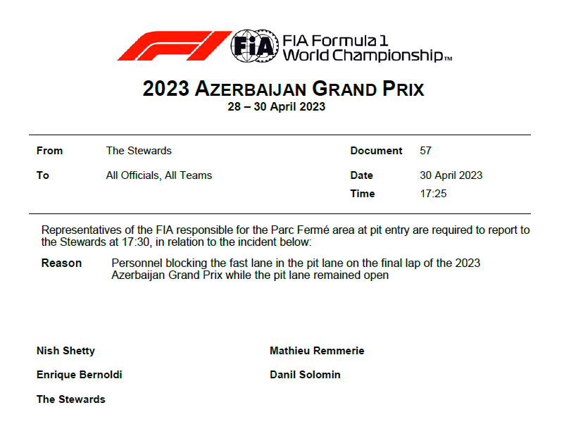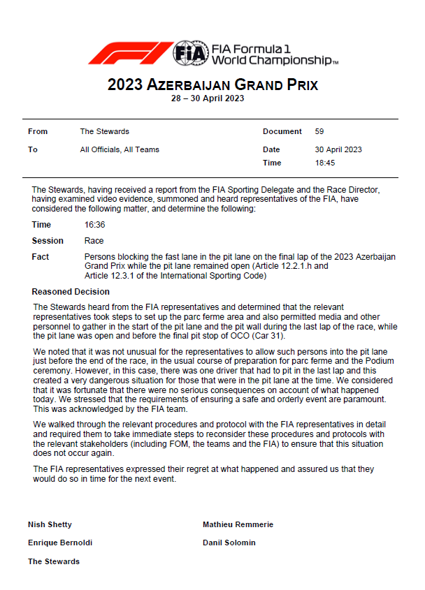 Il report finale specifica che non è la prima volta che viene fatta questa operazione: Abbiamo notato che non era insolito per i rappresentanti permettere a tali persone di entrare nella pit lane poco prima la fine della gara, nel consueto rituale di preparazione per il parco chiuso e la cerimonia del podio. Tuttavia in questo caso c’era un pilota che doveva effettuare la sosta all’ultimo giro e ciò ha creato una situazione molto pericolosa per coloro che si trovavano in pit lane in quel momento. Riteniamo che è stata una fortuna che non ci siano state conseguenze gravi per quanto successo oggi. Abbiamo sottolineato che i requisiti per garantire un evento sicuro e ordinato sono fondamentali. Questo è stato riconosciuto dal team della FIA. Abbiamo esaminato in dettaglio le procedure e il protocollo pertinenti con i rappresentanti della FIA e abbiamo chiesto loro di adottare misure immediate per riconsiderare tali procedure e protocolli con le parti interessate (inclusi FOM, i team e la FIA) per garantire che questa situazione non si ripeta . I rappresentanti della FIA hanno espresso il loro rammarico per quanto accaduto e ci hanno assicurato che lo faranno in tempo per il prossimo evento.
