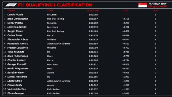 La prima sessione di qualifica del GP di Singapore è stata caratterizzata da una grande evoluzione della pista che ha costretto tutti a effettuare un secondo tentativo. La Ferrari ha corso un piccolo rischio facendo uscire i suoi due piloti all’ultimo minuto, tanto che Sainz era scalato fino al quindicesimo posto prima di completare il suo giro. Al contrario delle qualifiche di Baku però nessun giro è stato inficiato dall’esposizione di una bandiera gialla e quindi tutti i team sono riusciti a completare i loro piani. Le posizioni di testa sono state occupate da Norris, Verstappen e Piastri con l’inglese che ha comunque girato più piano rispetto alle FP3 del pomeriggio. Ancora bene Colapinto, nonostante una toccatina al muro in uscita di curva 17. Alla fine i piloti eliminati in Q1 sono stati Ricciardo, Stroll, Gasly, Bottas e Zhou, che quindi partiranno dalle ultime cinque posizioni in griglia domenica. In basso la classifica al termine del Q1 del GP di Singapore.