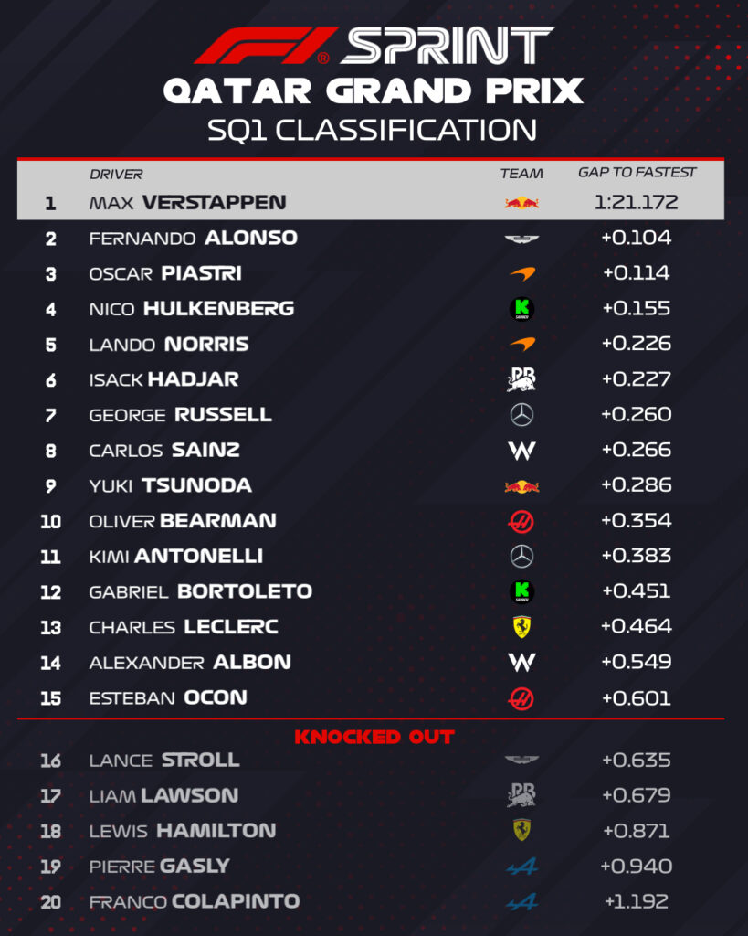 La prima sessione di qualifica ha regalato il primo colpo di scena della sessione: l’eliminazione di Lewis Hamilton. Il veloce miglioramento della pista, unito a un primo settore non brillante dell’inglese, ha giocato un brutto scherzo al sette volte campione del mondo, che non è riuscito ad andare oltre la diciottesima posizione e si è ritrovato eliminato nella prima sessione come a Las Vegas. Gli altri eliminati sono stati Stroll, Lawson e le due Alpine di Gasly e Colapinto. In basso la classifica al termine della SQ1.