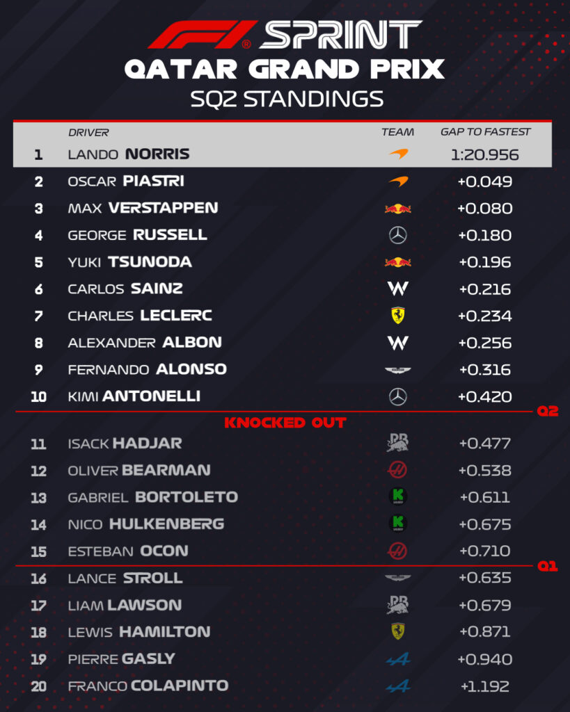 Nella seconda parte delle qualifiche sprint del GP del Qatar diversi piloti hanno effettuato delle escursioni sulla ghiaia. Questi sono stati Norris, Hulkenberg e Antonelli. Il pilota McLaren non ha avuto problemi a qualificarsi per la SQ3, forte del suo ottimo tempo messo a segno nel primo tentativo. Per Hulkenberg invece, che guida una Sauber e non una McLaren, l’uscita di pista è costata l’eliminazione. Antonelli ha rischiato molto, arrivando a trovarsi undicesimo allo scadere del tempo, ma per sua fortuna la direzione gara ha cancellato il tempo di Hadjar per track limits, permettendo all’italiano di salire in decima posizione. Gli altri eliminati sono stati, in ordine, Bearman, Bortoleto, Hulkenberg e Ocon. In basso la classifica al termine della seconda fase delle qualifiche sprint.