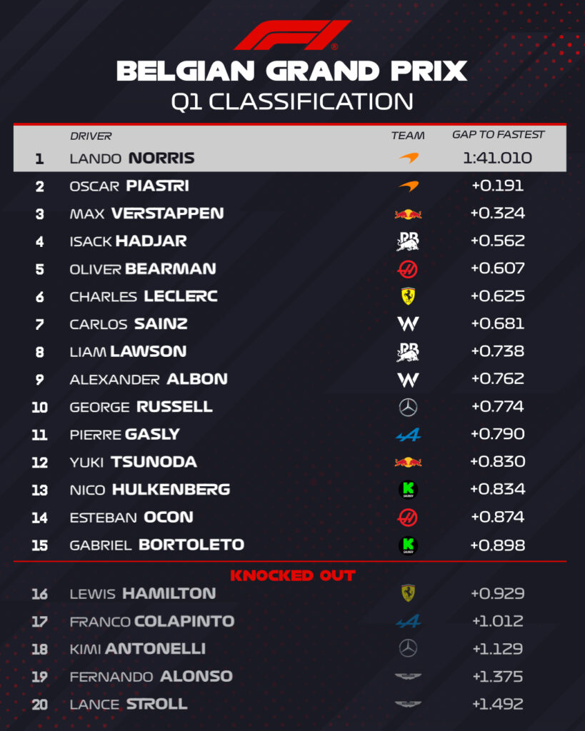 Nel primo giro della sessione diversi piloti sono scesi in pista con gomma usata solo per prendere i riferimenti della pista con macchina scarica e gomme soft dopo la Sprint Race corsa poche ore prima. La prima delle 3 sessioni di qualifica ha subito regalato sorprese: come ieri infatti sia Hamilton che Antonelli sono stati eliminati in Q1 e saranno costretti a partire dagli ultimi 5 posti nella gara di domenica. L’inglese si è dovuto accontentare della sedicesima posizione dopo che il suo ultimo tentativo è stato cancellato per track limits in curva 4 mentre Antonelli si è fermato addirittura in diciottesima riuscendo a battere solo le due Aston Martin. Le ultime 5 posizioni della griglia della gara saranno quindi occupate da Hamilton, Colapinto, Antonelli, Alonso e Stroll. In basso la classifica al termine del Q1 delle qualifiche del GP del Belgio.