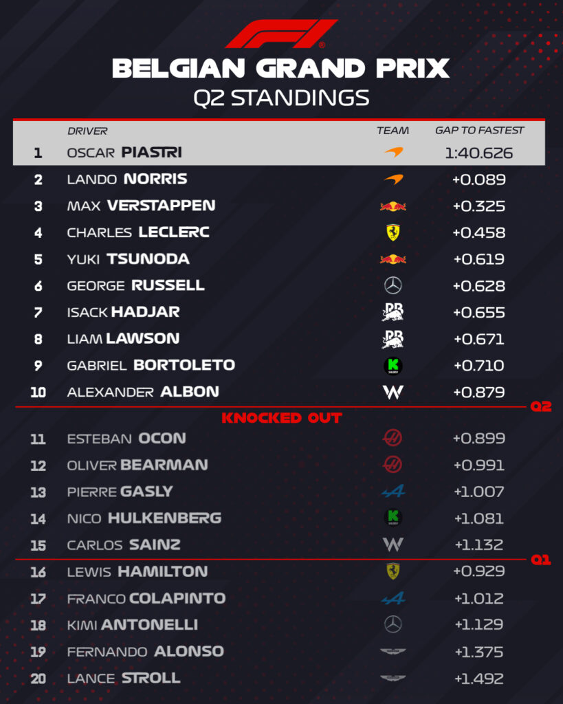La seconda sessione di qualifica si è conclusa senza particolari sorprese con l’eliminazione delle due Haas di Ocon e Bearman, l’Alpine di Gasly, la Sauber di Hulkenberg e la Williams di Sainz. Il pilota con più rimpianti per questa eliminazione è stato probabilmente Bearman, il quale nel primo tentativo ha rischiato un grosso incidente uscendo di pista al Pouhon a causa di un sovrasterzo e nel secondo tentativo ha commesso un errore in curva 1 che gli ha fatto perdere diversi decimi. Di seguito la classifica al termine della seconda sessione.