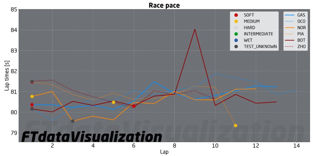 A centro gruppo Alpine e McLaren hanno girato tra l’1:20.5 e 1:21. Difficile decifrare l’Alfa Romeo che ha iniziato i run su gomme dure test girando più piano di Norris per poi assestarsi anch’essa tra l’1:20.5 e l’1:21 con gomme soft ma verosimilmente con minor carico di benzina.