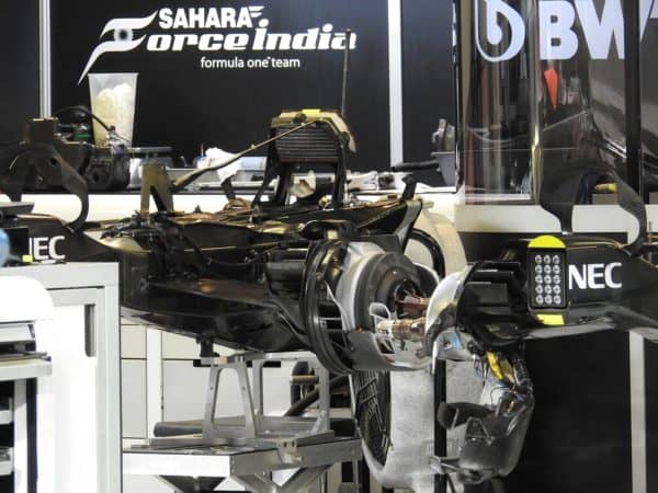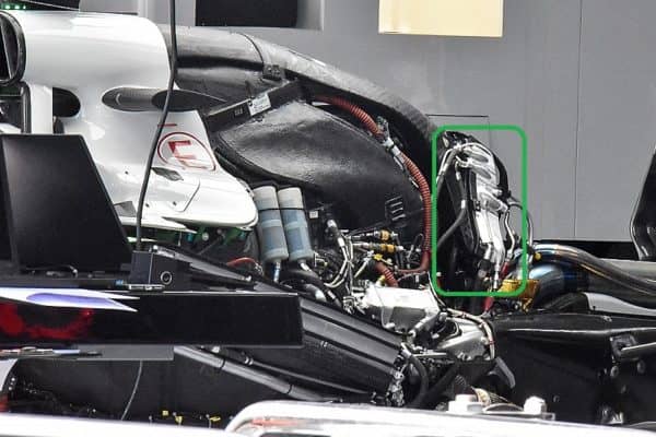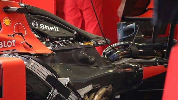 La rossa ha posizionato l’intercooler nella zona delle pance, utilizzandone una per il raffreddamento del complesso ERS, e l’altra per il raffreddamento del motore a combustione tradizionale, come si può vedere in questa foto dove si nota l’assenza del piccolo radiatore ai piedi del canale di aspirazione.