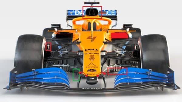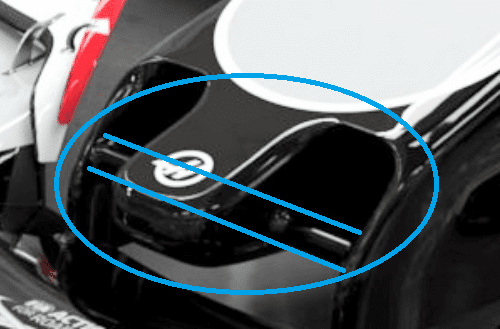 Il “mantello” ai lati del muso questa volta si attacca direttamente ai piloni dell’ala anteriore, che vanno quindi ad allargarsi. Le aperture delle pance sono state ristrette, mantenendo un disegno simile all’anno passato con il flusso utile allo scambio termico che passa al di sopra del cono anti intrusione che da norma di regolamento dev’essere posto al di sopra di una posizione.