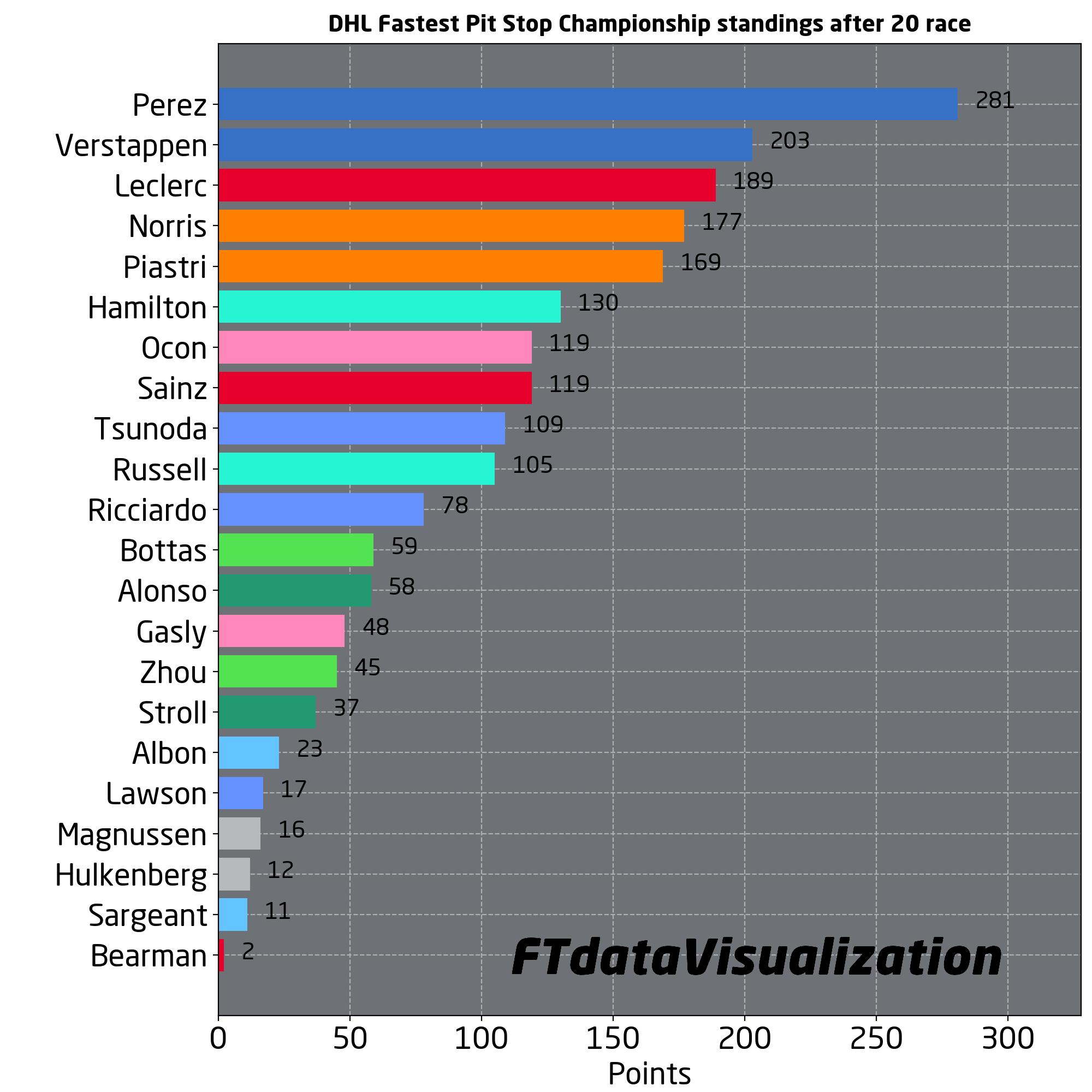 Visto che DHL assegnava premi solo ai team, come logico che sia, noi abbiamo pensato di creare parallelamente anche un campionato dei pit stop riservato ai piloti che tenesse conto dei punti segnati da loro secondo i risultati gara per gara, disponibili sul sito DHL Fastest Pit Stop Award. Ecco quindi la classifica piloti del Mondiale dei Pit Stop dominata dal matador Sergio Perez, che potrebbe diventare matematicamente campione con tre gare di anticipo.