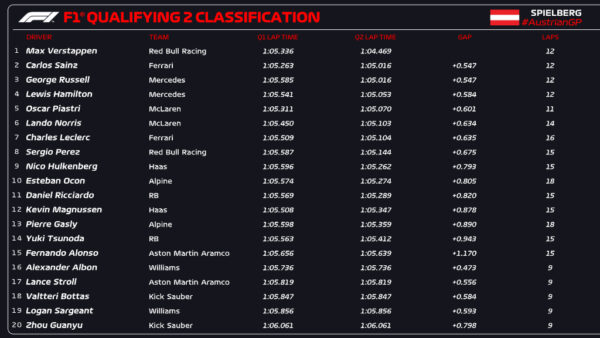 Nella prima parte della sessione quasi tutti hanno effettuato ben 3 tentativi di giro veloce. Hamilton è riuscito a salvarsi solamente durante il suo ultimo tentativo con gomme nuove. La Mercedes pare aver risolto tutti i problemi di porpoising dal momento che in Austria le due monoposto sono riuscite a girare bassissime, tanto da strisciare vistosamente nella frenata di curva 3 e quella di curva 9. Al termine della sessione tutti i piloti sono stati racchiusi in appena 8 decimi con il primo degli eliminati, Albon, a 475 millesimi dalla Ferrari di Sainz in testa. Gli altri eliminati sono stati Stroll, Bottas, Sargeant e Zhou. Tra i team di testa c’è stato grande equilibrio tra Red Bull, Ferrari e McLaren mentre Mercedes è parsa leggermente più in difficoltà in questa prima parte.