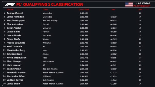 Nel Q1 i top team si sono alternati nelle posizioni di testa man mano che continuavano a girare e che la pista migliorava. Chi invece non migliora è Sergio Perez, eliminato ancora una volta in Q1. Il messicano ha girato n 1:34.155, ovvero quasi nove decimi più veloce del compagno di squadra, ma soprattutto 68 millesimi più lento di Lawson, ultimo dei qualificati. Il secondo pilota Red Bull sarà quindi costretto a una gara di rimonta partendo dal sedicesimo posto. In Q1 sono state eliminate anche le due Aston Martin di Alonso, il primo pilota a oltre un secondo di distacco dalla vetta (17°, +1.072 s), e Stroll (20°, +1.298 s). Il canadese ha avuto problemi durante le FP3 e i tempi necessari per riparare la monoposto gli hanno permesso di fare solo un giro in qualifica, che però per sua sfortuna non è stato sufficiente per passare. Gli altri due eliminati sono stati Albon, diciottesimo con Colapinto nono, e Bottas penultimo con Zhou quattordicesimo. In basso la classifica completa al termine del Q1 delle qualifiche del GP di Las Vegas.