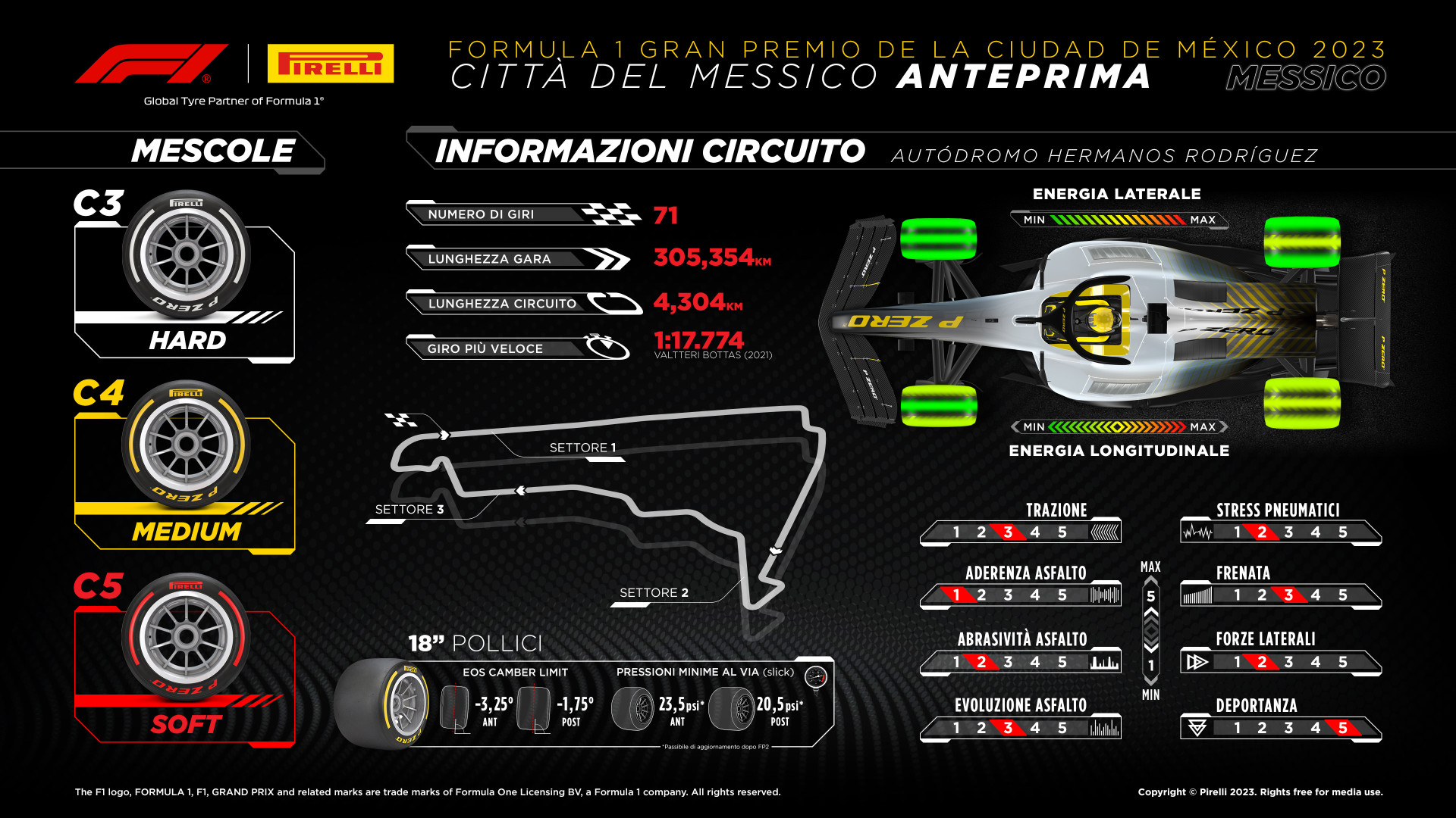 Per quanto riguarda le gomme, Pirelli per il GP del Messico ha deciso di mettere a disposizione di team e piloti la Hard C3, la Medium C4 e la Soft C5, vale a dire le mescole più morbide della gamma. “Il secondo appuntamento consecutivo di questa tournée americana della Formula 1 si svolgerà a Città del Messico, sul circuito intitolato alla memoria dei fratelli Pedro e Ricardo Rodriguez” – ha dichiarato Mario Isola, Direttore Motorsport di Pirelli – “Lungo poco più di quattro chilometri e caratterizzato da 17 curve, il circuito è situato nella zona orientale della capitale messicana, che si trova a oltre duemila metri di altitudine. Ciò ha un effetto rilevante sulla prestazione delle vetture, in quanto l’aria rarefatta riduce la resistenza all’avanzamento e il carico aerodinamico generato dalle monoposto: infatti, se la configurazione è solitamente quella usata sui circuiti che richiedono un livello di carico elevato, l’effetto sulle gomme è molto più basso. Anche il livello di aderenza prodotto dall’asfalto è nettamente inferiore alla media, visto che la rugosità è fra le più basse di tutto il calendario. Quest’anno abbiamo deciso di portare in Messico il tris di mescole da asciutto più morbido (C3, C4 e C5) a disposizione. È stata una scelta ben ponderata, sia sulla base dell’esperienza dello scorso anno sia sulle simulazioni che ci hanno fornito come sempre le squadre. Ciò dovrebbe portare ad una maggior varietà nelle scelte strategiche in gara, aprendo alla possibilità di effettuare due soste: nel 2022, quando le mescole scelte erano state C2, C3 e C4, quasi tutti i piloti effettuarono solamente un pit-stop, privilegiando una combinazione fra Soft e Medium. L’appuntamento di Città del Messico ci offrirà anche la possibilità di far valutare a tutte le squadre una variante della C4. Nelle due ore di prove libere del venerdì tutti i piloti avranno infatti a disposizione due set di prototipi di questa nuova mescola da utilizzare a loro piacimento. Una volta analizzati i dati, decideremo se omologare questa versione per un suo utilizzo nel 2024”. A disposizione dei team ci saranno ovviamente anche Intermedie e Full Wet, che stando alle attuali previsioni meteo (che parlano di temperature nell’ordine dei 22°) dovrebbero però poter dormire sonni tranquilli: la probabilità di precipitazioni è pari al 10% nelle giornate di venerdì e domenica, mentre il rischio di pioggia parrebbe essere totalmente scongiurato nella giornata di sabato.