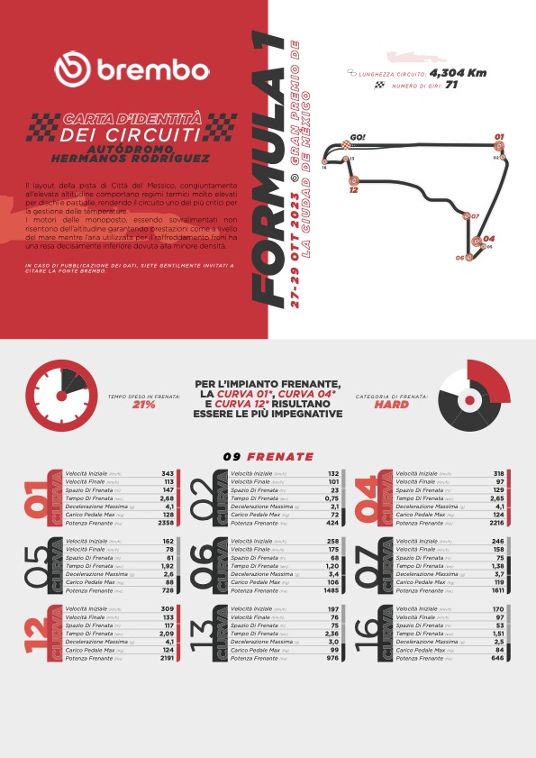 Brembo classifica il circuito messicano come impegnativo per i propri impianti frenanti, messi a dura prova non dall’altitudine ma dalle elevate temperature che solitamente vengono raggiunte nel corso del weekend anche a causa della scarsa densità dell’aria. I freni della ditta italiana verranno utilizzati in media per 16″5 ogni giro, vale a dire per il 21% del tempo complessivo di gara. La frenata più impegnativa dell’Hermanos Rodriguez è quella di Curva 1: lì le monoposto passeranno da oltre 343 a 113 km/h, percorrendo 147 m in 2”68, esercitando 128 kg di carico sul pedale del freno e subendo una decelerazione di 4,1 G. Non troppo sollecitato sarà il cambio, con l’edizione 2022 del GP che ha fatto registrare mediamente 50 cambiate nel corso di ogni giro, mentre la forza G più elevata in curva la si registra in percorrenza di Curva 10, dove i piloti subiranno 3,2 G laterali.