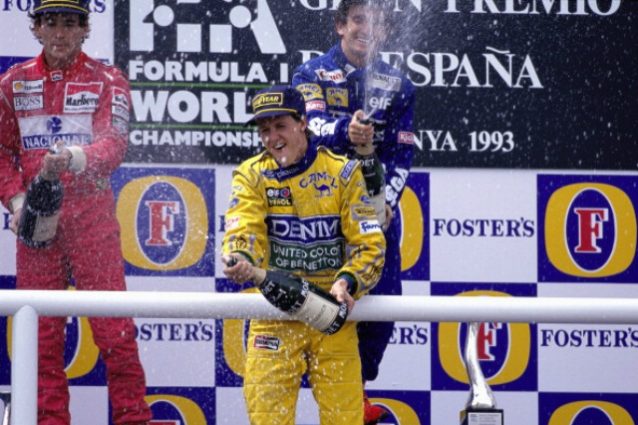 1993. A dominare sono le Williams-Renault di Prost e Hill, che infatti si prendono la prima fila anche di questo Gran Premio, davanti a Senna e Schumacher. La gara non è molto movimentata, e l’unico attimo di apprensione si ha al via, quando invece che la luce verde si accende quella gialla. Alla fine, la classifica vedrà vincere Prost, mentre Hill sarà costretto al ritiro per un problema meccanico. Scalano quindi di una posizione Senna e Schumacher, creando quindi, per l’unica volta della storia, un podio unico, comprendente (visto ovviamente a posteriori) 14 titoli mondiali e 183 vittorie, rendendolo il più vittorioso di sempre. Fu l’unica volta in cui i tre salirono insieme sul podio, e resta una delle fotografie più iconiche della storia dello sport.