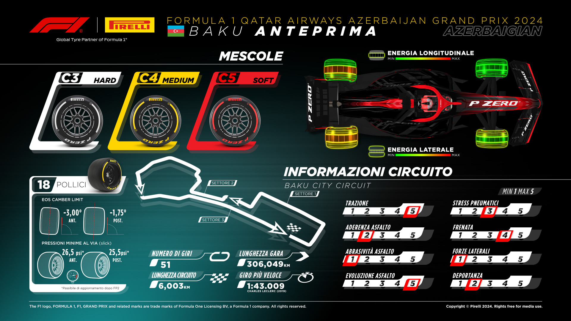 Pirelli per il GP dell’Azerbaijan ha messo a disposizione di team e piloti le mescole più morbide della propria gamma, ovverosia Hard C3, Medium C4 e Soft C5. Su un tracciato caratterizzato da una grandissima evoluzione della pista nel corso del fine settimana e in grado di mettere particolarmente sotto stress gli pneumatici dell’asse posteriore, saranno poi ovviamente presenti anche Intermedie e Full Wet. Così come accaduto a Monza, tuttavia, le coperture da bagnato della Pirelli dovrebbero poter dormire sonni tranquilli: nel momento in cui viene scritto l’articolo le previsioni meteo parlano di un clima soleggiato per tutto l’arco del weekend, con temperature medie nell’ordine dei 28°.