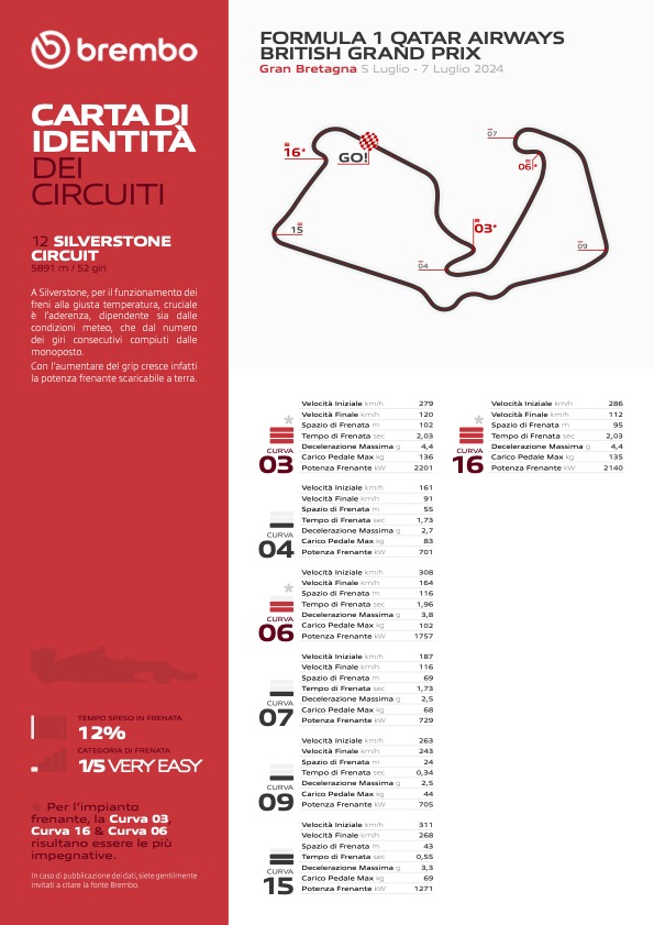 Secondo i dati forniti da Brembo quello di Silverstone è un circuito scarsamente impegnativo per i freni, essendosi meritato un indice di difficoltà pari a 1 in una scala che va da 1 a 5. I piloti trascorreranno in media 10”5 al giro – l’equivalente del 12% dl tempo complessivo di gara – aggrappati a pinze e dischi della ditta italiana, i cui impianti frenanti verranno messi a dura prova soprattutto dalla staccata di Curva 3: lì le monoposto passeranno da 279 km/h a 120 km/h percorrendo 102 m in 2”03, mentre i piloti eserciteranno 136 kg di pressione sul pedale del freno subendo una decelerazione di 4,4 G. Il record sul giro in gara appartiene a Max Verstappen, che nel 2020 ha fermato il cronometro sull’1:27.097, mentre la scorsa edizione del Gran Premio di Gran Bretagna è stata vinta da Max Verstappen, primo al traguardo davanti alla McLaren di Lando Norris e alla Mercedes di Lewis Hamilton.