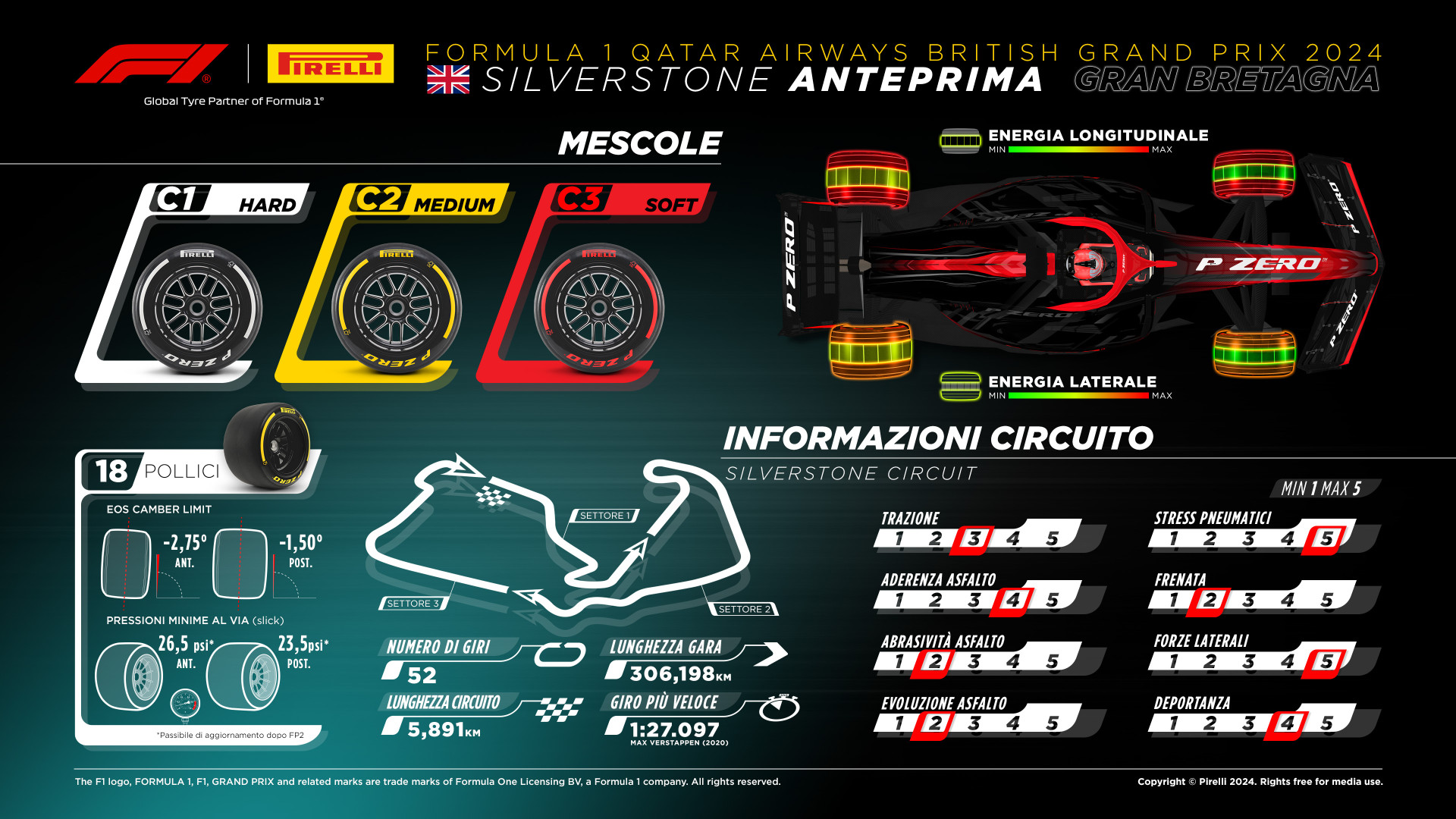 In occasione del GP di Gran Bretagna Pirelli ha messo a disposizione di team e piloti le Hard C1, le Medium C2 e le Soft C3, le mescole più dure della propria gamma. Silverstone, il cui layout è caratterizzato soprattutto da lunghe curve veloci, sottoporrà gli pneumatici a elevatissimi carichi laterali, comparabili a quelli esercitati da piste come Suzuka e Spa. In Gran Bretagna non mancheranno ovviamente neppure le Intermedie e le Full Wet che, come spesso accaduto in Inghilterra, potrebbero dovere essere utilizzate nel corso del fine settimana: nel momento in cui viene scritto l’articolo le previsioni promettono infatti pioggia in tutte e tre le giornate del weekend di gara, con temperature medie che dovrebbero oscillare attorno ai 17°.