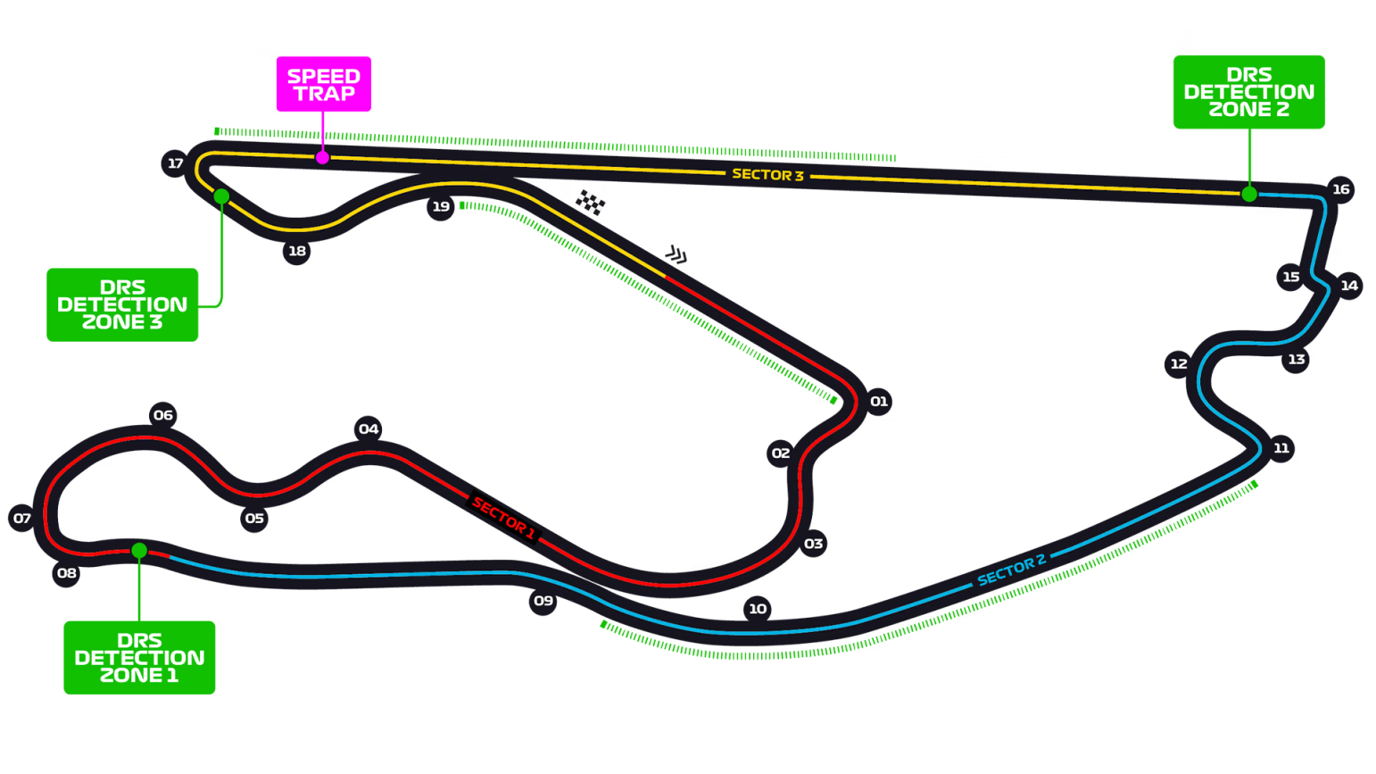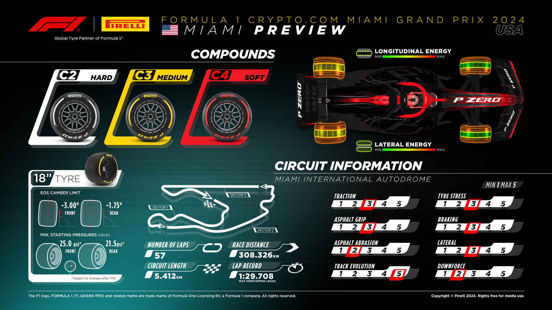 A fare da scenario alla sesta gara dell’anno sarà il Miami International Autodrome, un tracciato ricavato dalle strade che si snodano attorno all’Hard Rock Stadium, casa dei Miami Dolphins nella NFL. Un giro completo del circuitoè lungo 5,412 km e dunque, per percorrere i 308,326 km complessivamente previsti per il Gran Premio di Miami, ciascun pilota dovrà completare 57 giri. Sono 19 le curve che compongono questo tracciato semi-permanente (12 delle quali a sinistra e 7 a destra), mentre tre – con altrettanti Detection Point – saranno le zone DRS: la prima zona d’utilizzo dell’ala mobile sarà all’altezza dell’allungo che da Curva 9 conduce fino a Curva 11 con il Detection Point posizionato in uscita di Curva 8, la seconda sarà sul lunghissimo rettifilo che da Curva 16 porta a Curva 17 (con il Detection Point piazzato poco dopo l’uscita di Curva 16) e la terza troverà invece posto sul rettilineo di partenza e arrivo, con il Detection Point posizionato invece fuori da Curva 17.