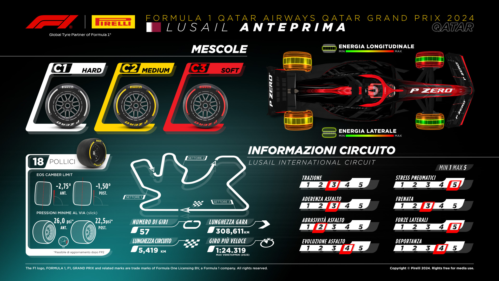 Pirelli per questo GP ha deciso di mettere a disposizione di team e piloti le mescole più dure della propria gamma, vale a dire Hard C1, Medium C2 e Soft C3. Nei mesi scorsi, per evitare il bailamme legato ai cordoli puntuti che ha caratterizzato l’edizione 2023, FIA e Pirelli hanno condiviso un programma di lavoro in vista del GP del Qatar: è stata smussata la punta dei cordoli piramidali in sette delle sedici curve che compongono il tracciato, e i tecnici del reparto R&D di Pirelli Motorsport hanno effettuato dei test sui banchi prova dinamici utilizzando una porzione dei nuovi cordoli fornita dalla FIA. Il fornitore milanese ha ovviamente portato con sé anche Intermedie e Full Wet, ma entrambe le coperture da bagnato non dovrebbero essere utilizzate in Qatar: le previsioni meteo parlano infatti di un weekend privo di precipitazioni, con temperature medie che oscilleranno attorno ai 22°.