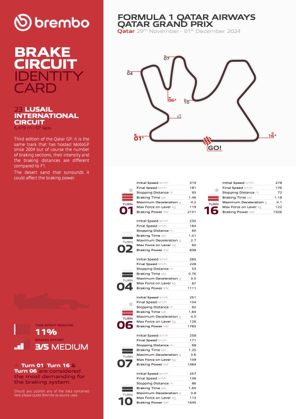 Un giro del circuito di Lusail è lungo 5,419 km, e per percorrere i 308,611 km previsti per il Gran Premio del Qatar i piloti dovranno completare 57 giri. Il layout del Lusail International Circuit è composto da 6 curve a sinistra e da 10 curve a destra e, secondo i dati di Brembo, non è particolarmente stressante per l’impianto frenante.