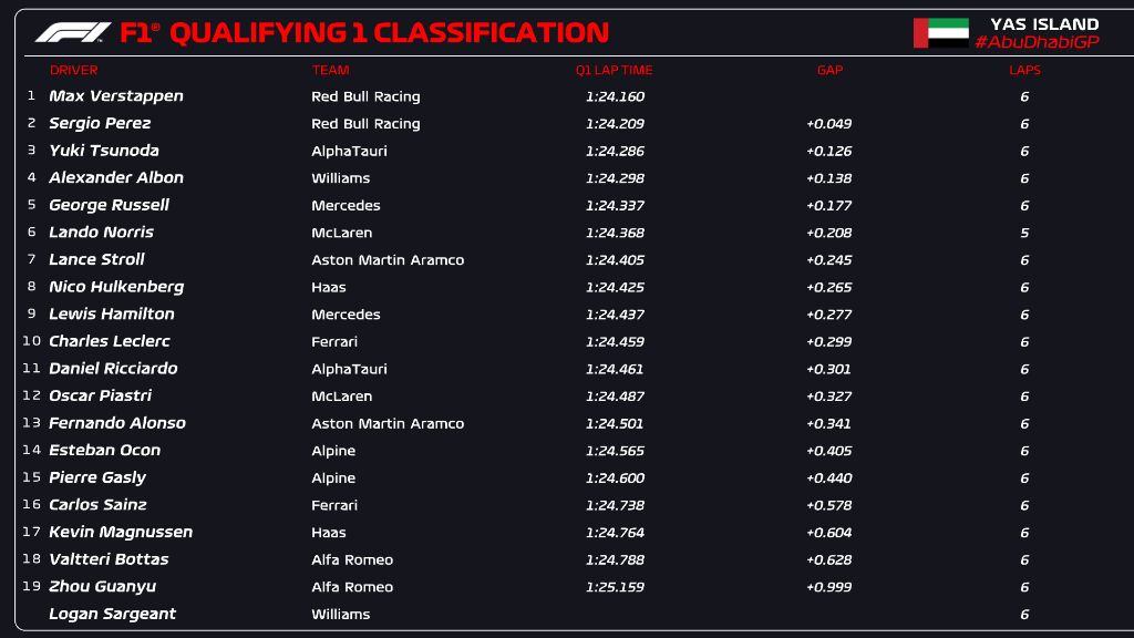 È Max Verstappen il più veloce al termine del Q1 delle qualifiche del GP di Abu Dhabi. L’olandese, che sembra essere tornato ad avere il solito feeling con la sua Red Bull dopo una sessione di FP3 piuttosto complessa, ferma il cronometro sull’1’24”160 andando così a precedere per 49 millesimi il compagno di squadra Sergio Perez, issatosi al 2° posto con un colpo di reni proprio nel finale. Ottimo 3° è Yuki Tsunoda, che sfruttando la grande evoluzione della pista si piazza davanti ad Alexander Albon e a George Russell, 5° davanti a Lando Norris. 7° è Lance Stroll, a precedere un buon Nico Hulkenberg, mentre Lewis Hamilton – 9° – termina la manche davanti a Charles Leclerc e Daniel Ricciardo, appena fuori dai primi dieci con la seconda delle AlphaTauri. 12ª piazza per Oscar Piastri, davanti a Fernando Alonso ed Esteban Ocon, con Pierre Gasly che è l’ultimo dei piloti a staccare un biglietto per la fase centrale delle qualifiche del Gran Premio di Abu Dhabi. Primo degli esclusi è infatti Carlos Sainz, clamorosamente escluso già nel Q1 per via di un 1’24”738 davvero poco esaltante: il #55, che oltre ad avere tra le mani una SF-23 non performante come al solito sul giro secco si è anche ritrovato a dover gestire del traffico, è riuscito a fare meglio dei soli Kevin Magnussen, Valtteri Bottas, Guanyu Zhou e Logan Sargeant, ultimo con entrambi i giri veloci cancellati per violazione dei track limits.