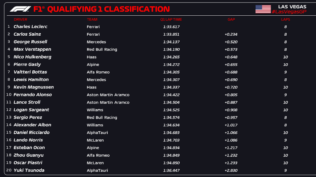 Il Q1 delle qualifiche del GP di Las Vegas di Formula 1 scorre senza particolari colpi di scena. Charles Leclerc si prende la prima posizione in 1’33”617, con Carlos Sainz e George Russell a inseguire il #16 davanti a Max Verstappen e a un ottimo Nico Hulkenberg. Su una pista che continua costantemente a migliorarsi è Pierre Gasly ad artigliare la 6ª piazza, con Valtteri Bottas – 7° in 1’34”305 – che in questa prima fase delle qualifiche si toglie la soddisfazione di chiudere davanti al suo ex compagno di squadra Lewis Hamilton, 8° a precedere Kevin Magnussen. Fernando Alonso e Lance Stroll conquistano rispettivamente la 10ª e 11ª posizione, mentre un pimpante Logan Sargeant strappa il 12° posto davanti a Sergio Perez e Alexander Albon. L’ultimo pilota a staccare un biglietto per il Q2 è Daniel Ricciardo, che con un colpo di reni nel finale mette clamorosamente fuori Lando Norris, primo degli esclusi con un ritardo di oltre 1” dalla vetta della classifica. Insieme al #4 vengono eliminati al termine della Q1 Esteban Ocon (protagonista di una scaramuccia con Max Verstappen), Guanyu Zhou, Oscar Piastri – in quella che è una giornata nerissima per il team di Woking – e Yuki Tsunoda, furibondo come sempre una volta rientrato in garage.