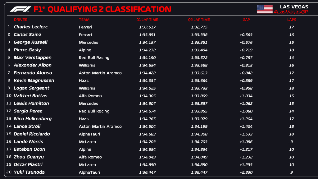 Anche durante il Q2 delle qualifiche del Gran Premio di Las Vegas di F1 non si verifichino particolari sorprese. Davanti a tutti, a conferma dell’ottimo stato di forma mostrato finora dalla Scuderia Ferrari, c’è di nuovo Charles Leclerc: il #16 ferma il cronometro sull’1’32”775, staccando di oltre mezzo secondo tanto Carlos Sainz quanto George Russell e di oltre 7 decimi Pierre Gasly (4°) e Max Verstappen. 6° è un ottimo Albon, alla guida di una Williams particolarmente in palla sull’asfalto del Las Vegas Strip Circuit, mentre Fernando Alonso precede un buon Kevin Magnussen, uno straordinario Logan Sargeant e Valtteri Bottas. Il #77 replica quanto accaduto nel corso del Q1 piazzandosi davanti al suo ex compagno di squadra Lewis Hamilton che, di conseguenza, è il primo degli esclusi in questa seconda manche. Alle spalle del #44 si mettono Sergio Perez, Nico Hulkenberg, Lance Stroll (che dovrà scontare 5 posizioni di penalità sulla griglia di partenza per avere superato Sainz in regime di bandiere gialle) e Daniel Ricciardo.