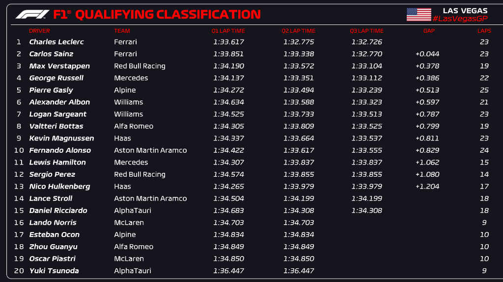 Il Q3 delle qualifiche del GP di Las Vegas di Formula 1 si chiude nel segno di Charles Leclerc. Il monegasco, in grande spolvero sin dai primissimi giri percorsi sul circuito cittadino del Nevada, firma la pole position facendo segnare un 1’32”726 che stacca di appena 44 millesimi la SF-23 gemella di Carlos Sainz. La seconda posizione conquistata dallo spagnolo aumenta a dismisura il rammarico per quanto successo nel corso delle FP1 del weekend di Las Vegas: il #55 infatti, costretto a montare sulla sua Ferrari la terza batteria per via dei danni subiti a seguito dell’incidente con il coperchio di un tombino, dovrà infatti scontare 10 posizioni di penalità sulla griglia di partenza del Gran Premio venendo quindi costretto ad accomodarsi sulla 12ª casella dello schieramento. Ad affiancare Charles Leclerc in prima fila sarà quindi Max Verstappen, 3° oggi con un ritardo di 378 millesimi dal crono del #16, mentre George Russell e un sorprendente Pierre Gasly andranno a occupare rispettivamente la 3ª e 4ª posizione davanti a una terza fila… tutta Williams. Alexander Albon e Logan Sargeant terminano infatti le loro qualifiche con il 6° e 7° tempo, precedendo Kevin Magnussen e un Fernando Alonso che delude un po’ nel momento decisivo della sessione.