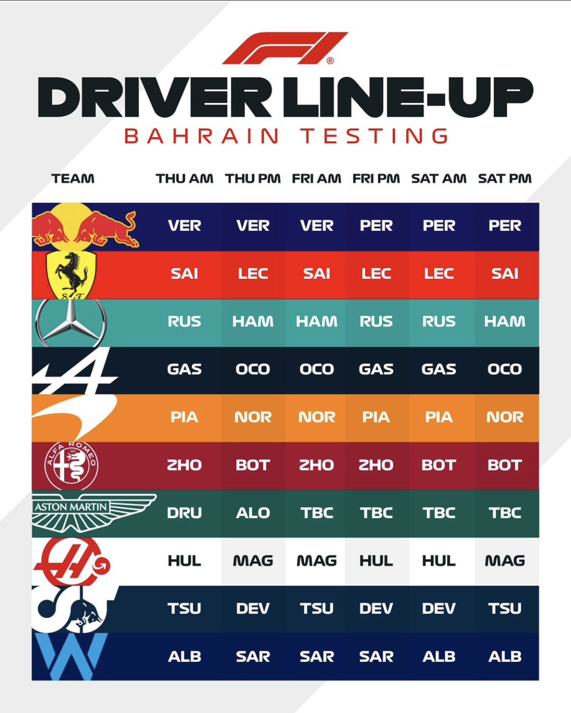 Lavoreranno poi in modo speculare a Mercedes la Alpine, la McLaren e l’Alfa Romeo, mentre ancora qualche incognita aleggia sulle modalità di lavoro dell’Aston Martin. Ritrovatasi a dover far fronte all’assenza di Lance Stroll, la scuderia inglese ha reso nota la sua line up per la sola giornata del giovedì, quando Felipe Drugovich saggerà la AMR23 al mattino prima di cedere onore, oneri e volante a Fernando Alonso. Voci di corridoio dicono che il Campione della Formula 2 potrebbe essere utilizzato anche al venerdì e al sabato per far sì che – in caso di ulteriore forfait di Stroll – possa presentarsi pronto anche al weekend di gara del Bahrain, ma nel momento in cui l’articolo viene scritto non sono state ancora fornite indicazioni più precise da parte della scuderia.