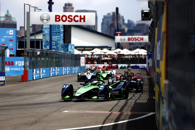 Il primo round del New York E-Prix è stato caratterizzato dal meteo mutevole, che ha portato alla sospensione della corsa quando mancavano sette minuti e mezzo più un giro. A vincere è stato Nick Cassidy, partito sorprendentemente dalla pole dopo aver battuto Stoffel Vandoorne di soli otto millesimi, conquistando così la sua prima vittoria in carriera. Non ha però potuto avere l’onore di passare per primo sotto la bandiera a scacchi: il neozelandese è stato infatti protagonista di un terribile incidente nel corso del trentesimo giro quando un violento scroscio di pioggia ha sorpreso tutti i piloti, creando una pericolosissima pozza in curva 6, che ha portato in sequenza ad uscire di pista Cassidy, Di Grassi, Vandoorne e Mortara, mentre Frijns è incredibilmente passato incolume, nello stesso posto dove poco prima era uscito fuori di pista Da Costa. Nello stesso istante, la vettura di Wehrlein si è spenta in mezzo alla pista, provocando un altro incidente a catena. Alla fine, il risultato della gara è stato quindi retrodatato al giro 29, assegnando così la vittoria a Cassidy. Sul podio con lui ci sono anche Di Grassi e Frijns, a completare la festa del team Envision, mentre quarto è Vandoorne, con il belga che può dirsi soddisfatto da una parte, ma deluso dall’altra; se da un lato non è riuscito ad approfittare dell’errore in qualifica dei suoi diretti rivali in campionato, Mortara, Evans e Vergne, che non sono entrati nella fase dei duelli, dall’altro ha comunque guadagnato punticini importanti, che saranno utili a fine campionato. Quinto è Buemi (protagonista finalmente di una buona prestazione), mentre seguono in zona punti Wehrlein, Dennis, Bird, De Vries, Mortara e Dennis. Gli ultimi due sono stati penalizzati per aver superato il limite di velocità in regime di Full Course Yellow, con lo svizzero che ha quindi dovuto abbandonare la sua quinta posizione, mentre l’inglese è scivolato dall’ottavo al decimo. Il punto addizionale del giro più veloce l’ha ottenuto Mortara. Chiudono fuori dalla zona punti Evans (undicesimo) e Vergne (diciottesimo), partiti nelle retrovie e protagonisti di un incidente al primo giro, quando il neozelandese della Jaguar ha tamponato il francese della DS Techeetah. Sfortunato infine Antonio Giovinazzi: il pilota di Martina Franca durante le prove libere aveva fatto segnare tempi interessanti (chiudendo decimo nelle FP2), ma lo scroscio di pioggia sopraggiunto nel corso del suo turno di qualifiche gli ha impedito di far meglio della decima fila, essendo sceso in pista per ultimo; in gara è stato poi costretto al ritiro nel corso nel primo giro per problemi tecnici. Classifica piloti: Mortara 142, Vandoorne 137, Vergne 128, Evans 124, Frijns 96. Classifica costruttori: Venturi 226, Mercedes 214, DS Techeetah 203.